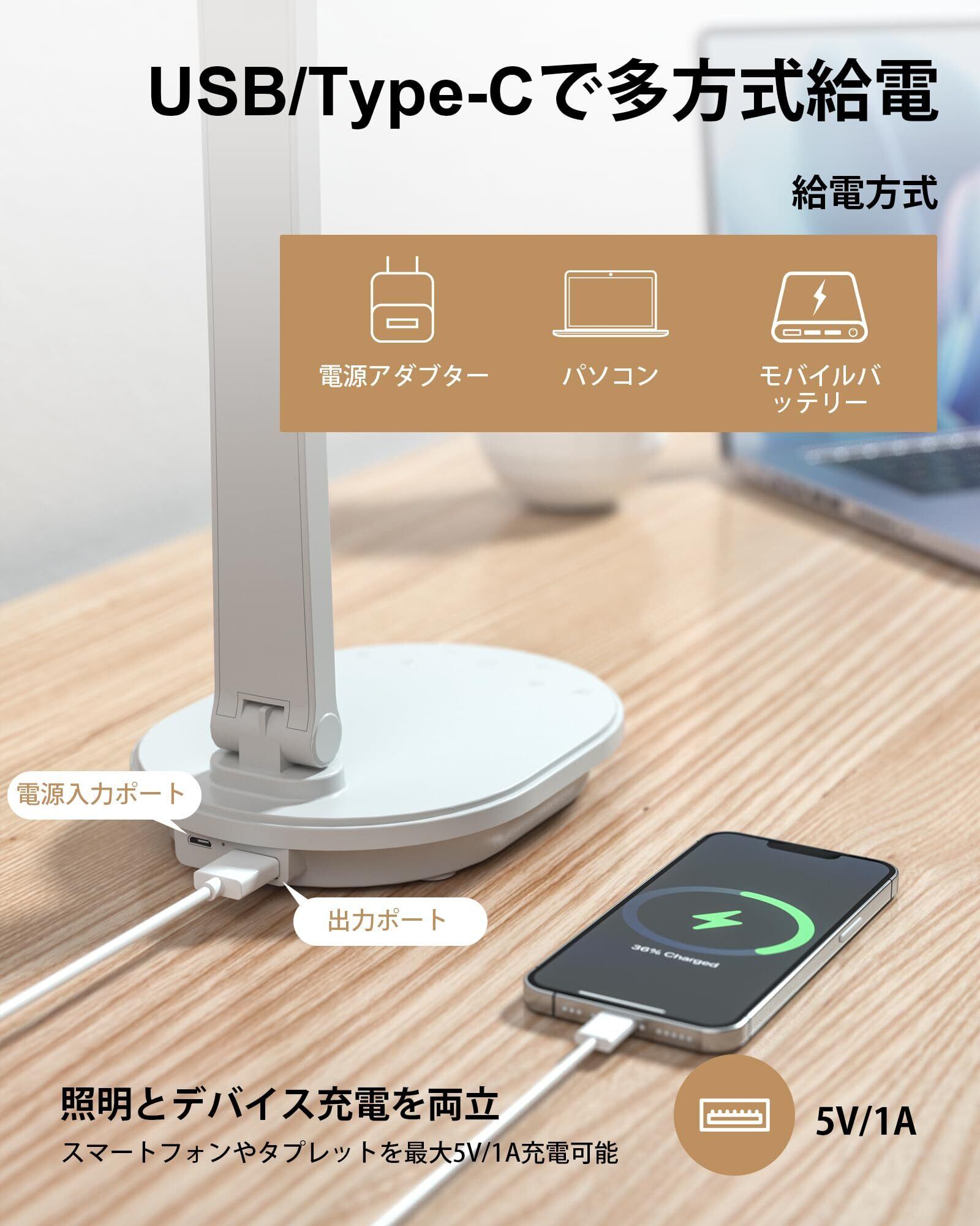 【USB出力ポート・Type-C入力ポート】このデスクライトはUSB出力ポート(MAX:5 V/2 A)を採用して、照明入力もType-Cポートを採用しています。机の上だけでなく、移動中や外出時にも、学習灯として活用する。