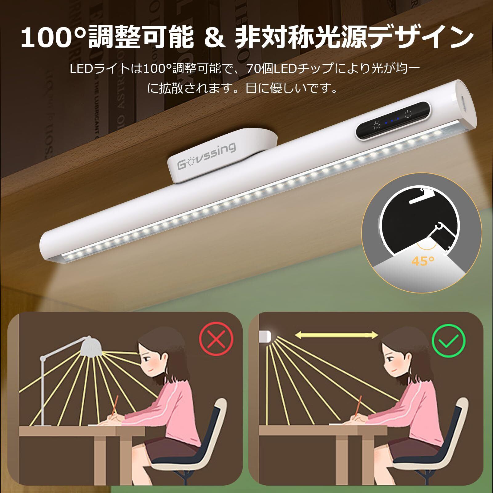 デスクライト Govssing LEDライト 4000mAh バッテリー残量インジケーターライト付き ネジ取り付けが可能 Type-C充電式 卓上ライト おしゃれ 目に優しい 電気スタンド タッチ式 3種類色温と無段階調光 100度角度調節可能 マグネットとリモコン付き タイミング機能 読書灯 間接照明 壁掛けライト 勉強、ベット、机、車内、化粧鏡などに適用