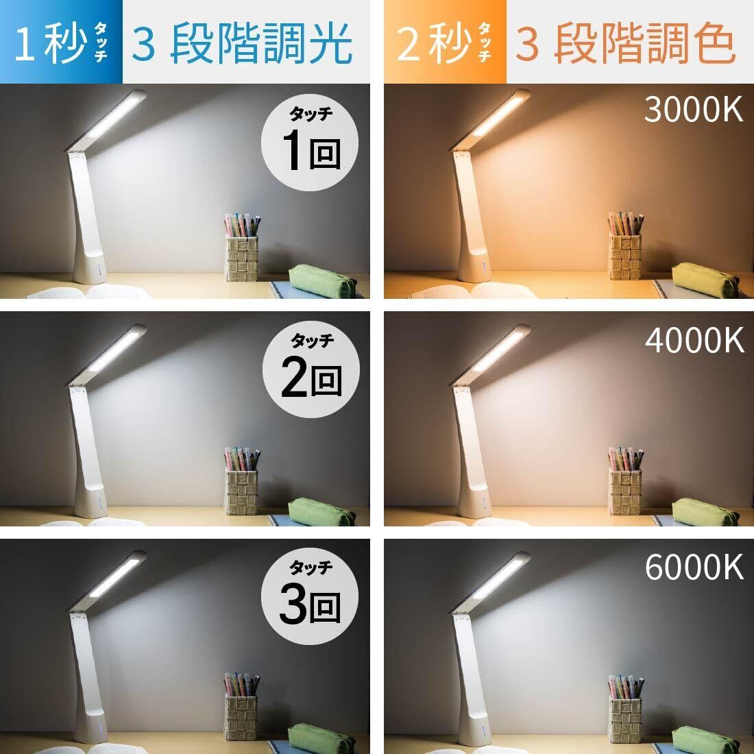 【 特 長 】 ◆3段階調光と3段階調色の組み合わせで用途に合わせて選べる9つの点灯モード ◆タッチセンサーで明るさと光色を切り換えできます ◆1秒タッチで3段階調光、2秒タッチで3段階調色 ◆目に優しい設計 ◆USB充電式、リン酸鉄リチウムイオン電池採用 ◆本体カラーはホワイト
