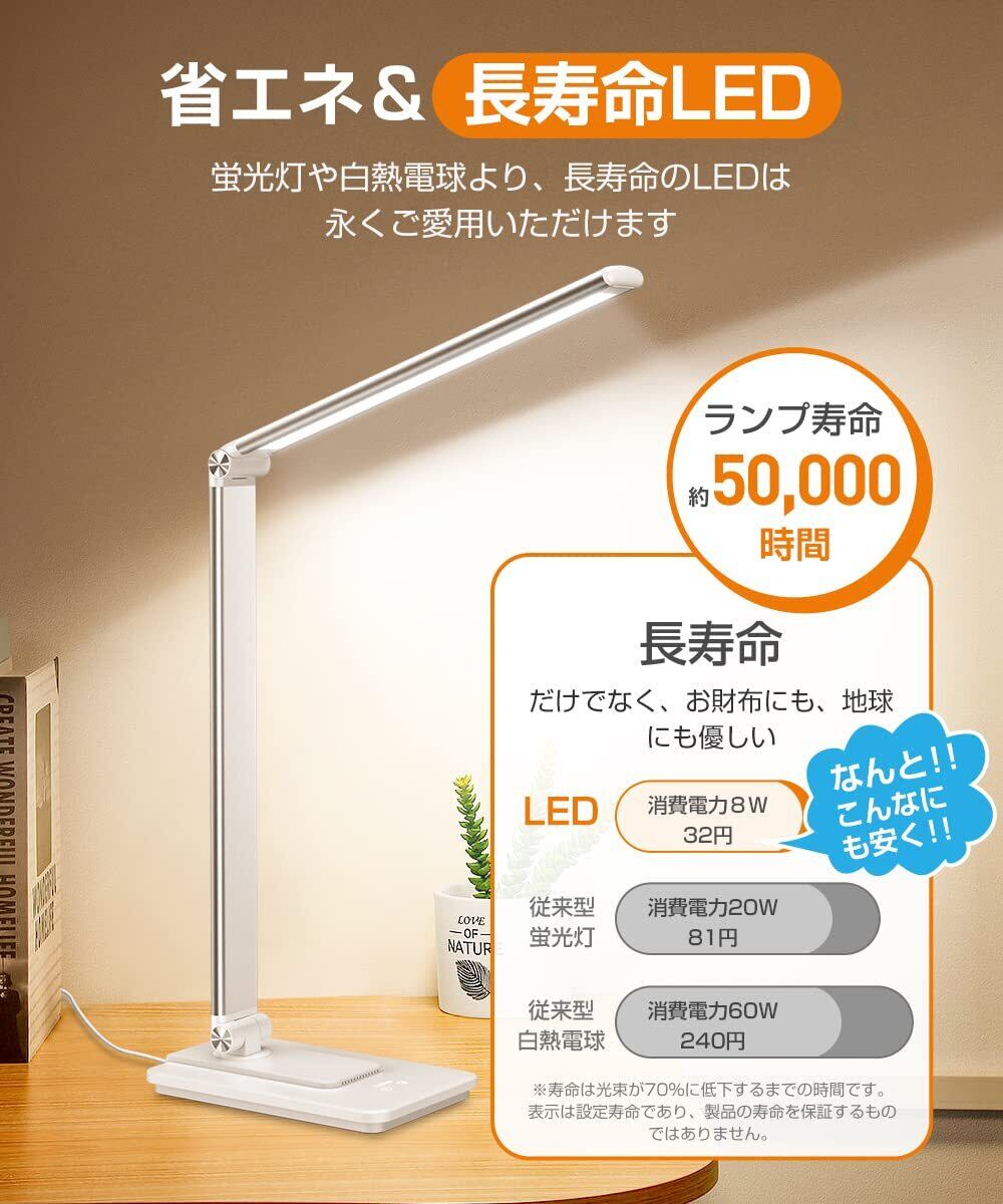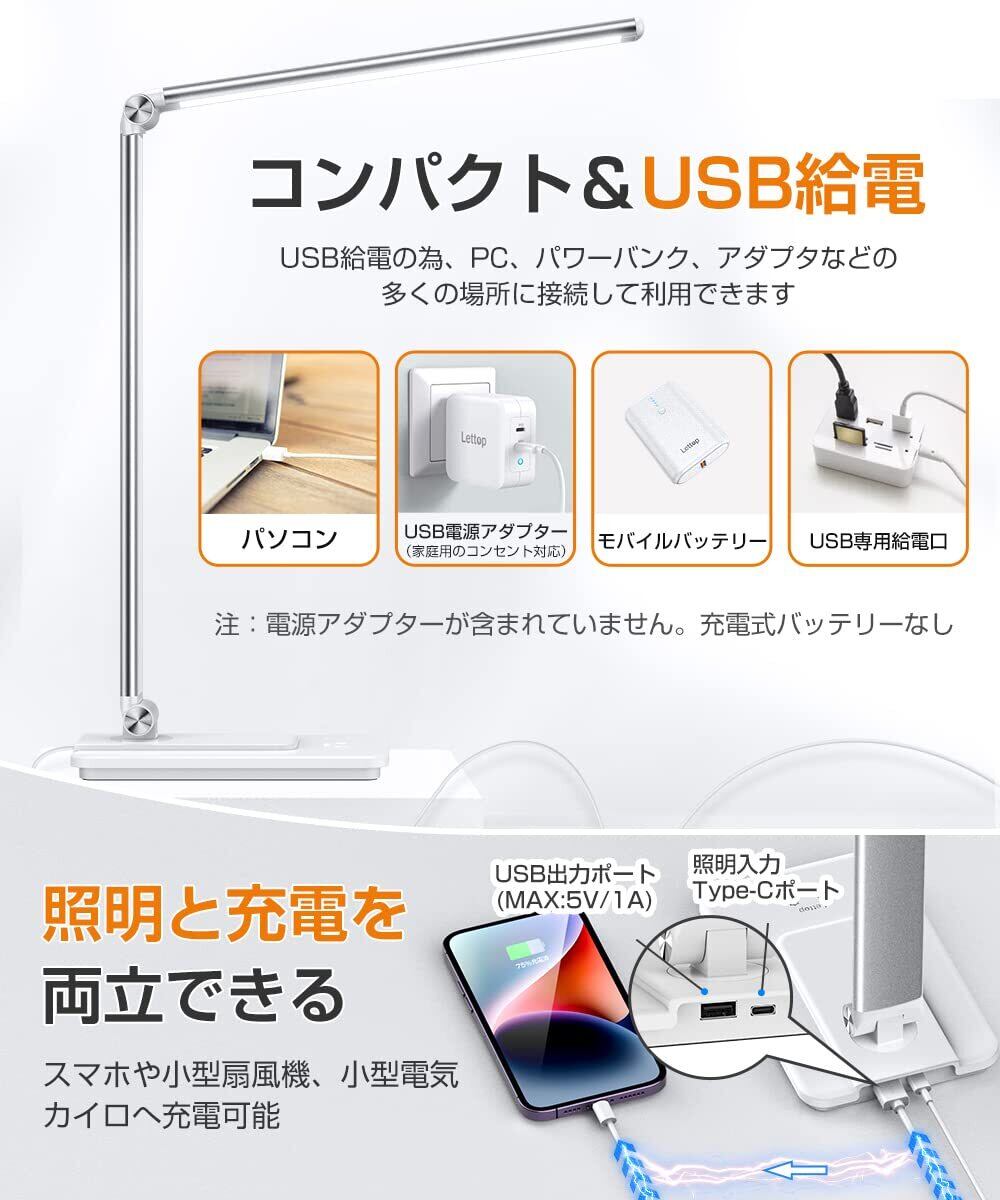 【省エネ&長寿命 LEDデスクライト 】最新技術を搭載した省エネかつ長寿命の led デスクライト は、お部屋を明るく照らすだけでなく、エネルギーの使用量を削減し、地球環境にも優しい 省エネ ledライト 照明 となります。 ledライト が600ルーメンの高輝度とRa>90の高演色性で、自然光に近い品質の光を実現。長時間の勉強や作業も目の疲れを軽減し、快適にサポートする スタンドライト です。 【USB給電式:どこでも簡単充電】 この デスク ライト はUSB給電式を採用しており、PC、モバイルバッテリー、またはUSBアダプターから簡単に充電できます。デスクの上だけでなく、移動中や外出先でも柔軟に使用可能で、便利な充電方式がライフスタイルに合わせて照明を提供する ledライト 卓上 となります。