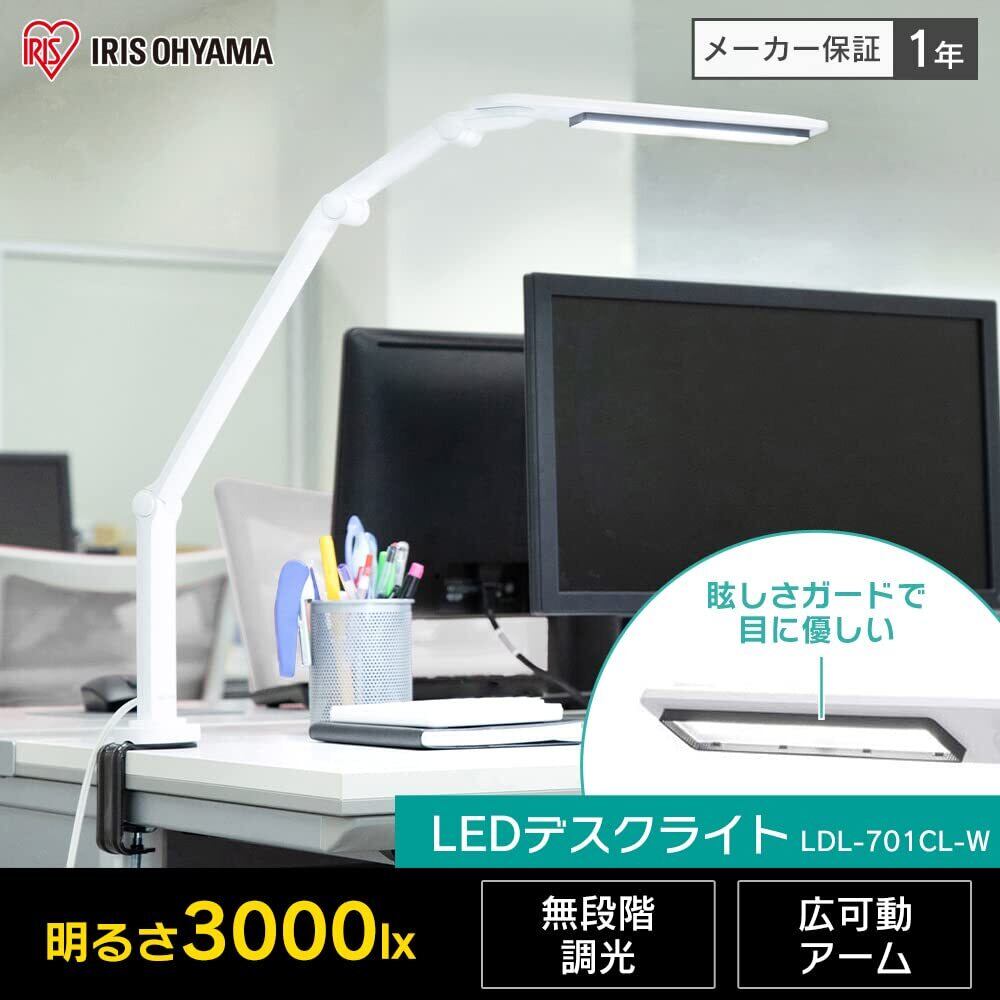 \【◆【文字が見やすい】 アイリスオーヤマ デスクライト クランプタイプ 省スペース 調光無段階 角度調節可能 まぶしさガード付 省エネ 3000lx ホワイト LDL-701CL-W】/あなたの作業環境を快適にするための理想的なデスクライト!