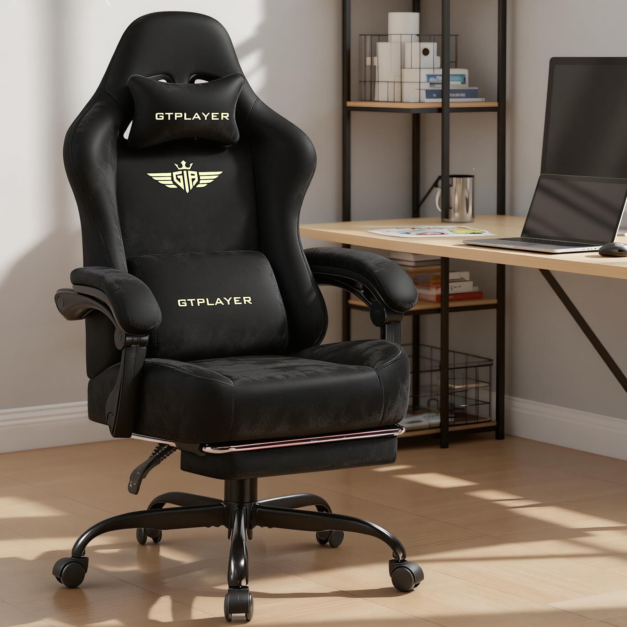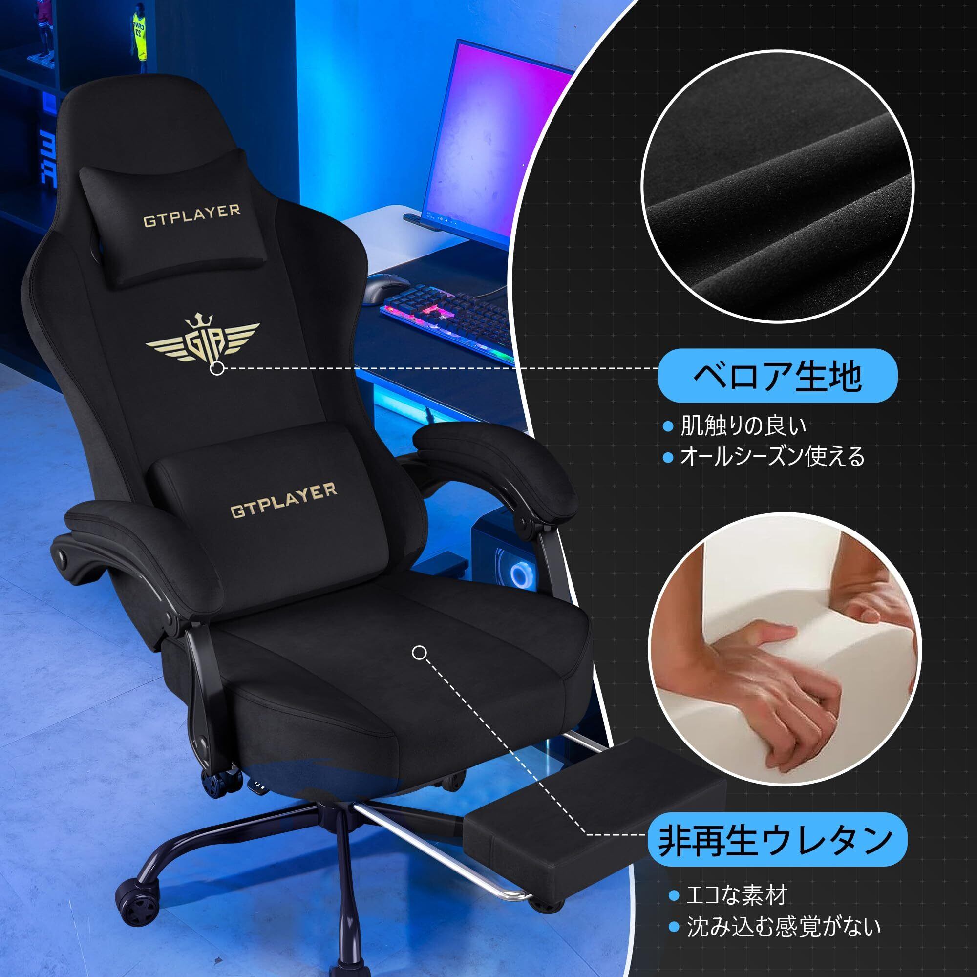 GTPLAYER ゲーミングチェア なめらかなベロア デスクチェア オフィスチェア あぐら 椅子 ゲーム用チェア リクライニング ハイバック テレワーク椅子 PCチェア フットレスト 連動アームレスト ポケットコイル 座面の幅 50cm 四季適用 在宅ワーク 通気性 GT829-BLACK