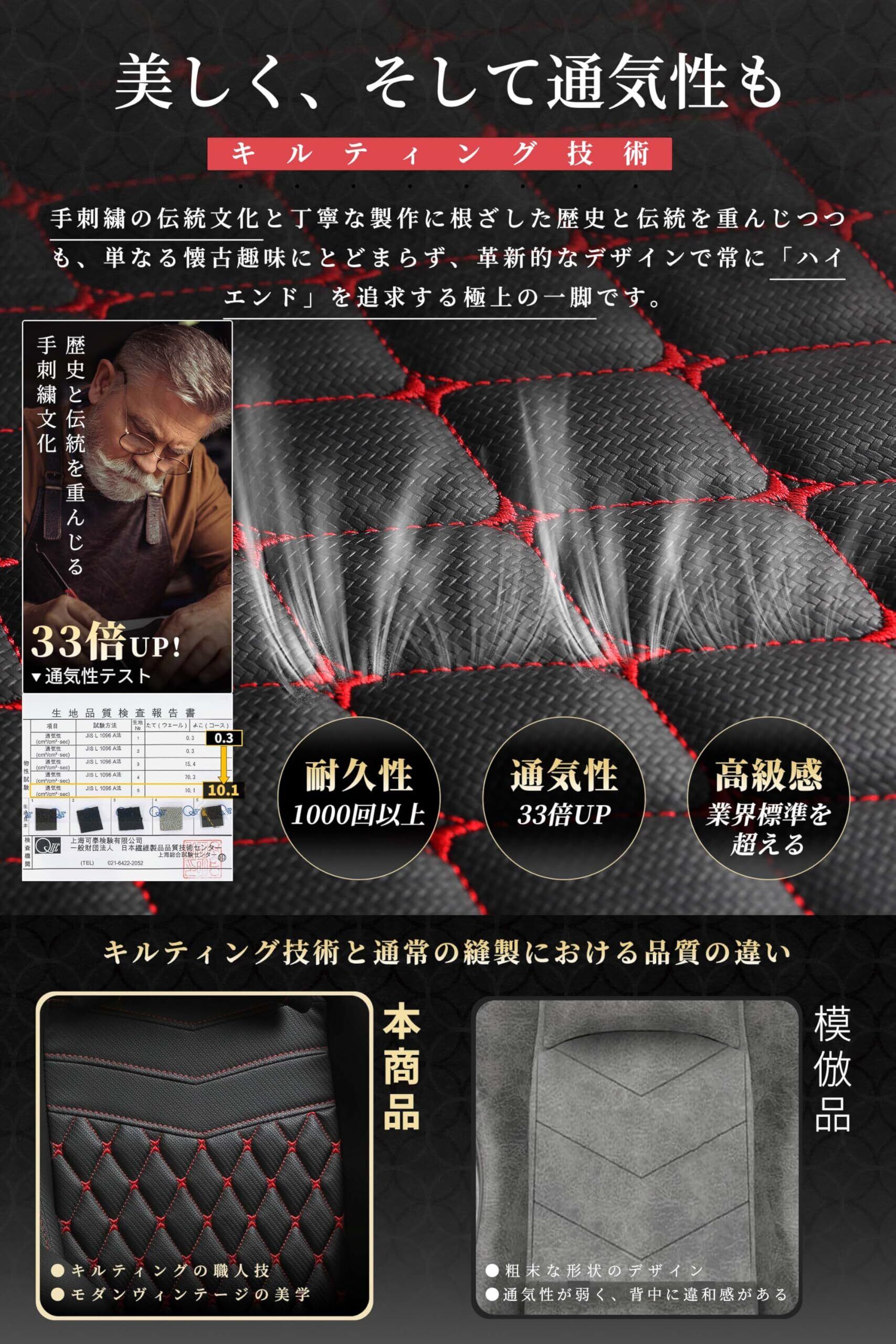 【高品質素材】 新開発の炭素繊維レザーを使用し、高級感と滑らかな手触りを実現。キルティング刺繍が施され、通気性が33倍に向上し、蒸れにくく、見た目も美しく仕上がっています。夏でも快適に使用できる高品質スポンジを背もたれと座面に採用しています。