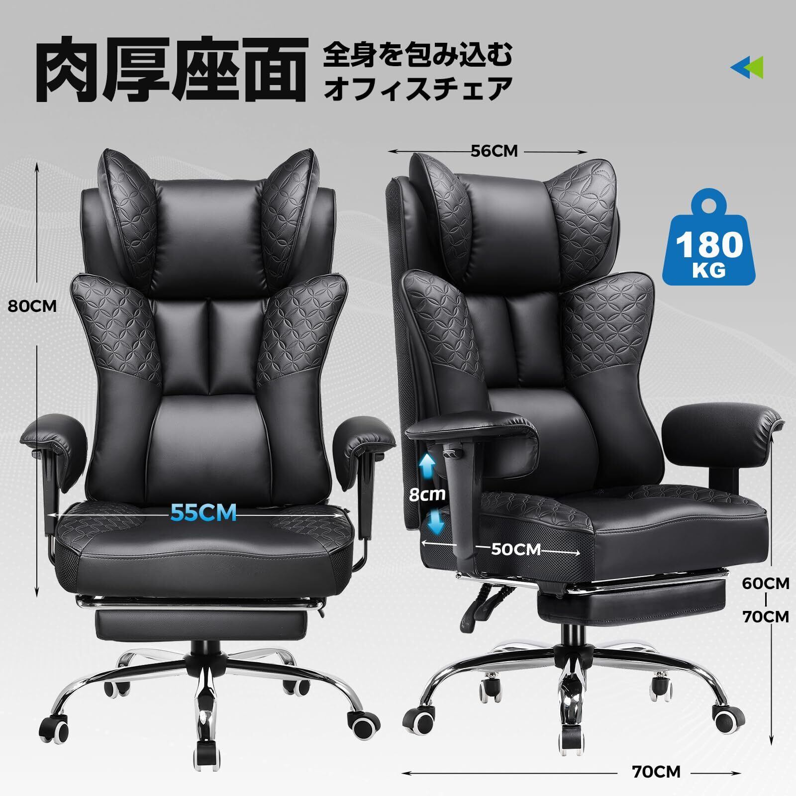 【さらに進化!大人気の型押しデザイン】型押しデザインのチェアがアップグレードして新登場。「上品な型押しデザイン」×「腰部内蔵ポケットコイル」×「通気性のある側面メッシュ」×「体を包み込む」×「ウィングバックデザイシ」×「高さ調節可能なアームレスト」×「広めの背もたれ」×「肉厚のクッション」×「広々とした座面」×「PUレザー」×「一体型オットマン」×「反発力のある座面」×「ほぼフラットに倒せる150°リクライニング」など、多彩な機能が揃っています。背中にゆとりを感じられる広めの設計で、包み込まれるような座り心地がさらに快適に。