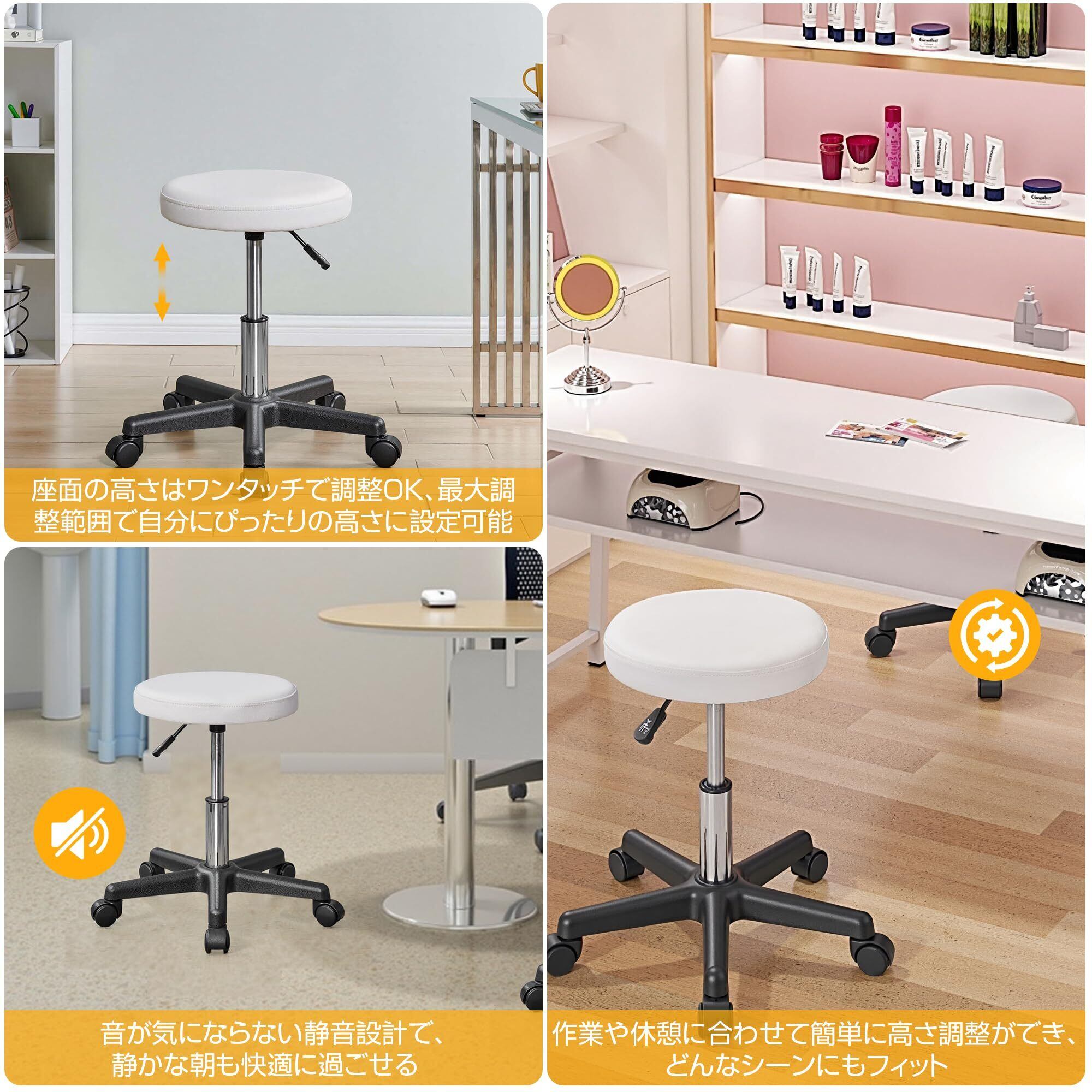 【活躍シーン】:オフィスや自宅のワークスペース、書斎、パソコン作業に最適。診療所、理容室、美容室、ネイルサロン、エステサロンなど、さまざまな施術シーンでも活躍します。キャスター付きで移動もスムーズ、昇降機能で高さ調整も簡単にできます。