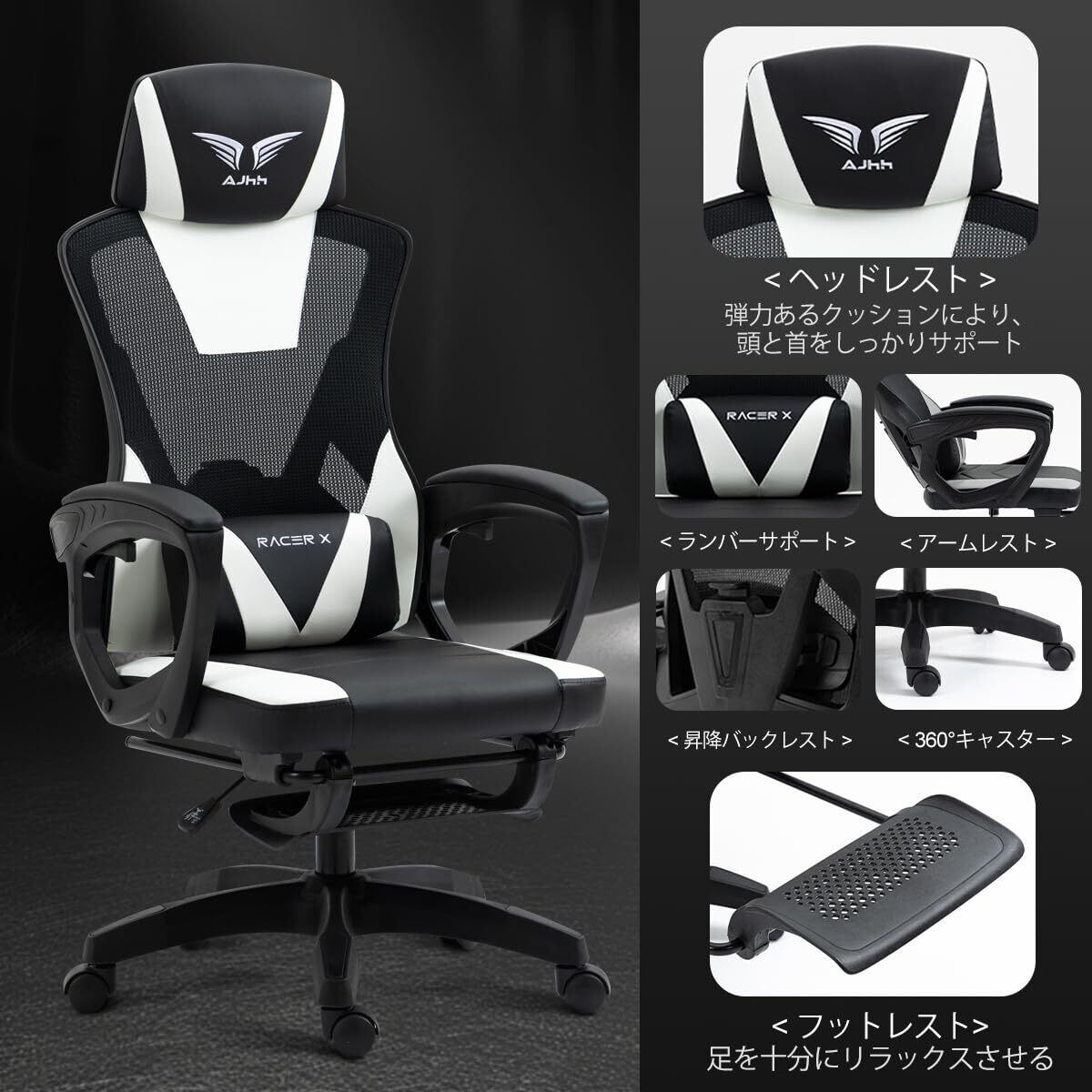 ゲーミングチェア メッシュ素材 げーみんぐチェア 通気性 リクライニング機能 オフィスチェア 135°ゲームチェア 高級PUレザー オットマン付き