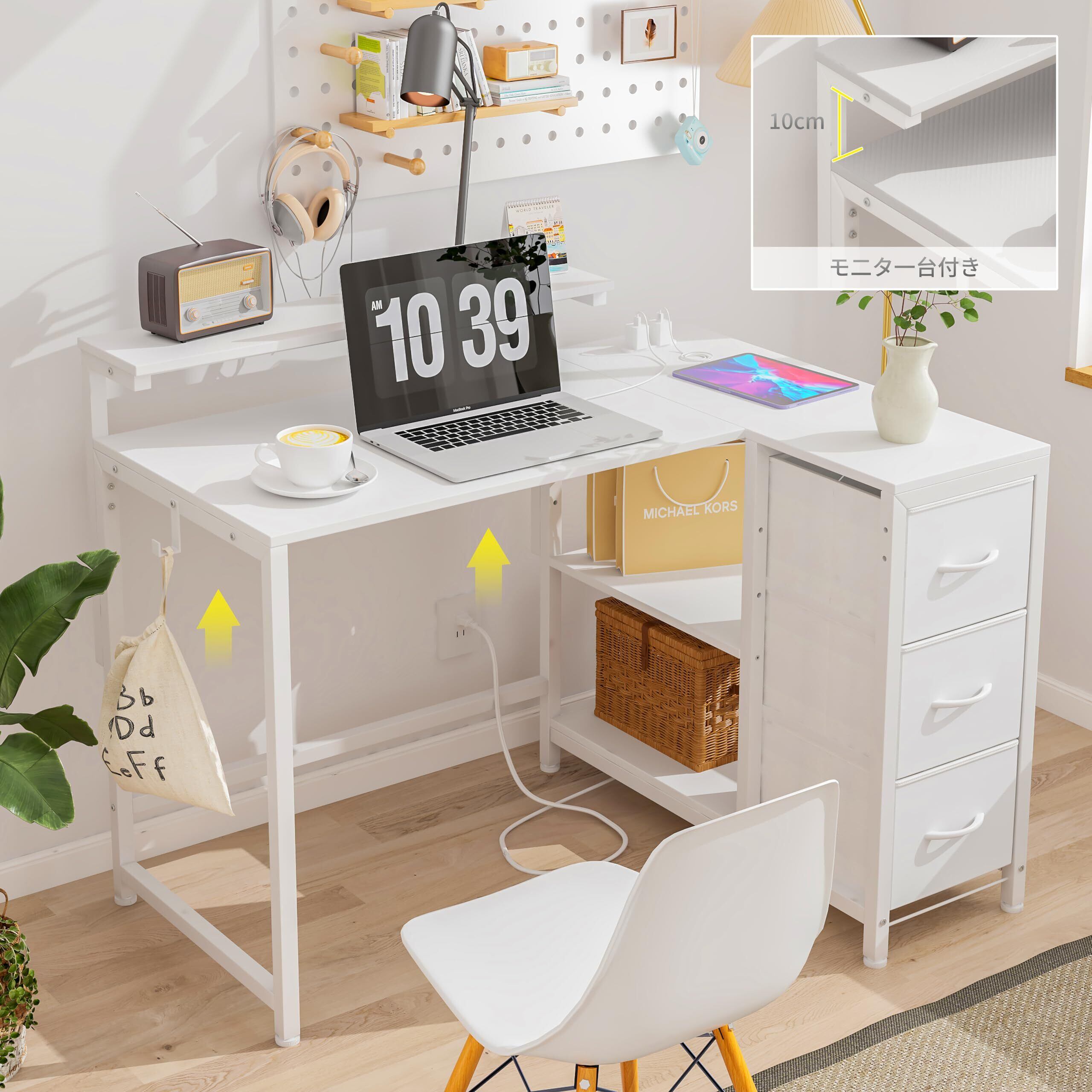 LunarLight PCパソコンデスク幅108*奥行50-80*高さ72cm テレワーク 机 L型左右組み換え自由 モニタ台の高さ調節可能 引き出しとコンセント付き 収納たっぷり ゲーミングデスク オフィスデスク 書斎 収納ラック付き(カーボンファイバーホワイトWH)