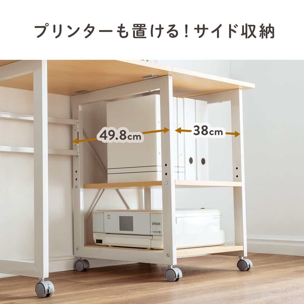 横幅107cmでノートパソコンとプリンタなどを並べて置いても余裕のサイズです。キャスター付きで移動もらくらくすることができます。