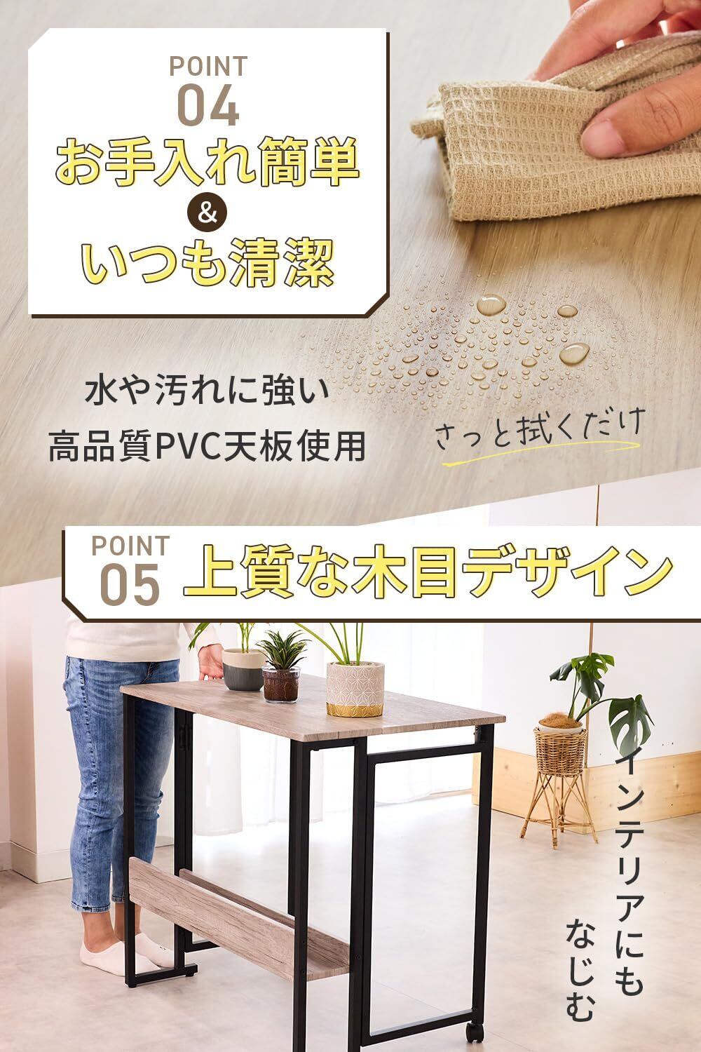 【5. 高品質PVC天板でお手入れラクラク】 汚れや水に強いPVC天板を採用。テーブル 折りたたみとして、 食事や趣味にも安心して使え、いつでも清潔を保てます。