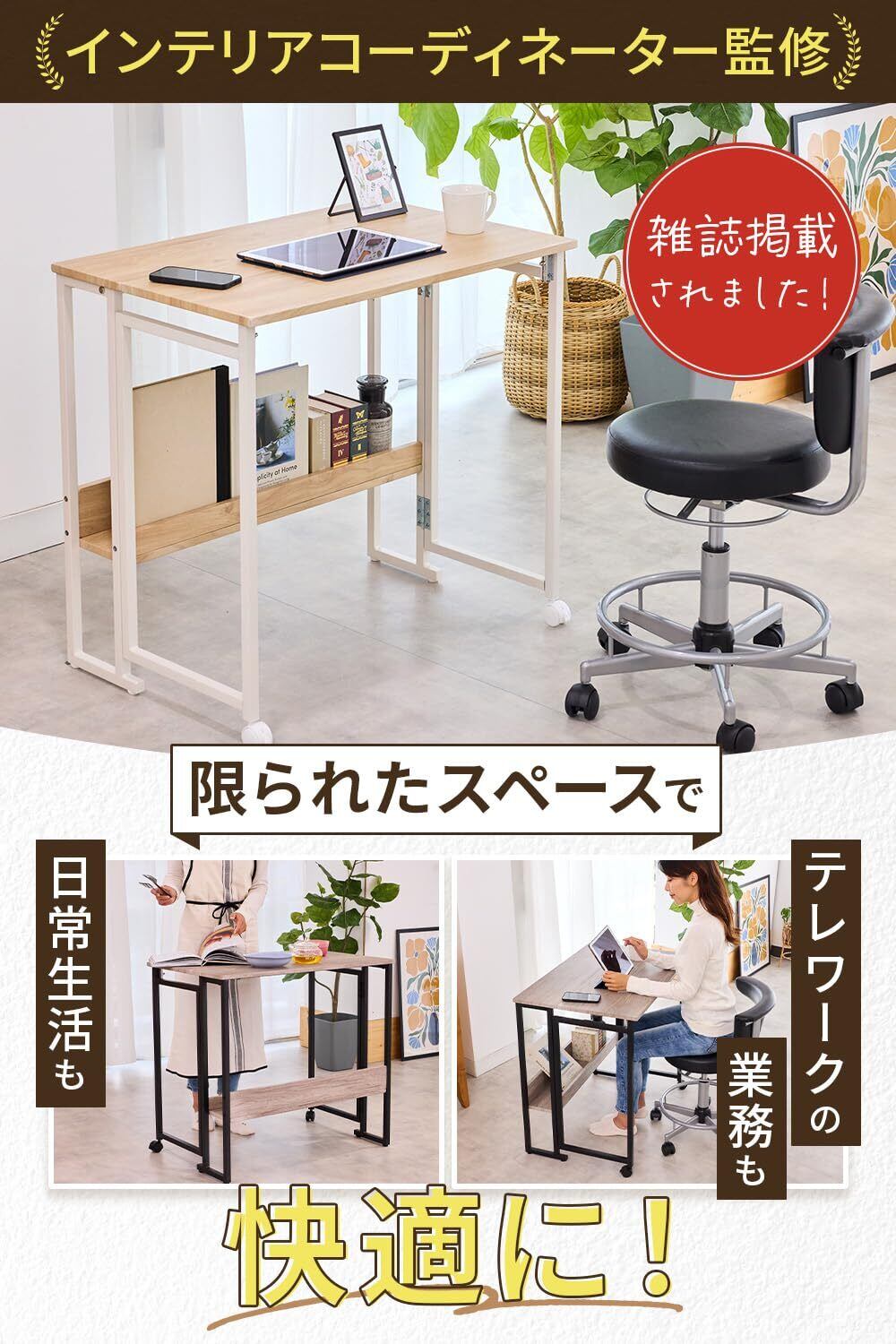 【折りたたみデスク|折りたたみテーブル】 雑誌『I'm home.』掲載|インテリアコーディネーター監修 限られた空間でも、仕事も日常も快適に。 テレワークや勉強机、作業机としても使える、 収納力抜群の折りたたみデスクが登場。
