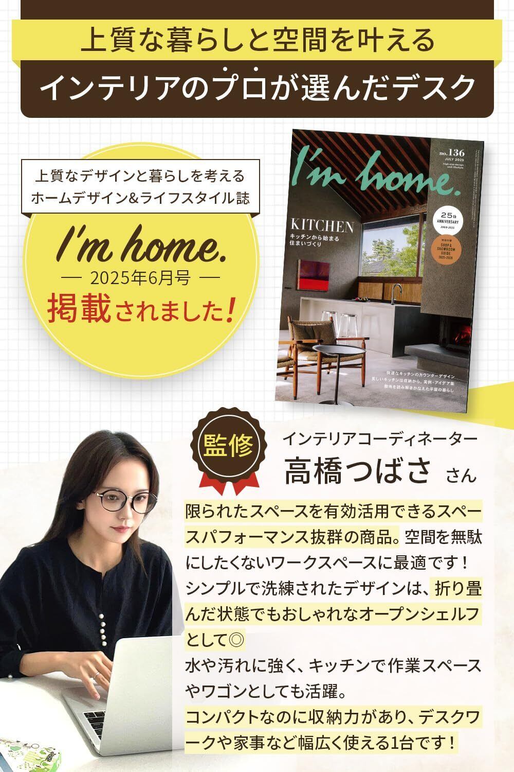 【1. 雑誌掲載&プロ監修の信頼設計】 インテリア雑誌『I'm home.』にも掲載! 空間づくりのプロであるインテリアコーディネーターが監修した、 デザイン性と実用性を両立した一台です。