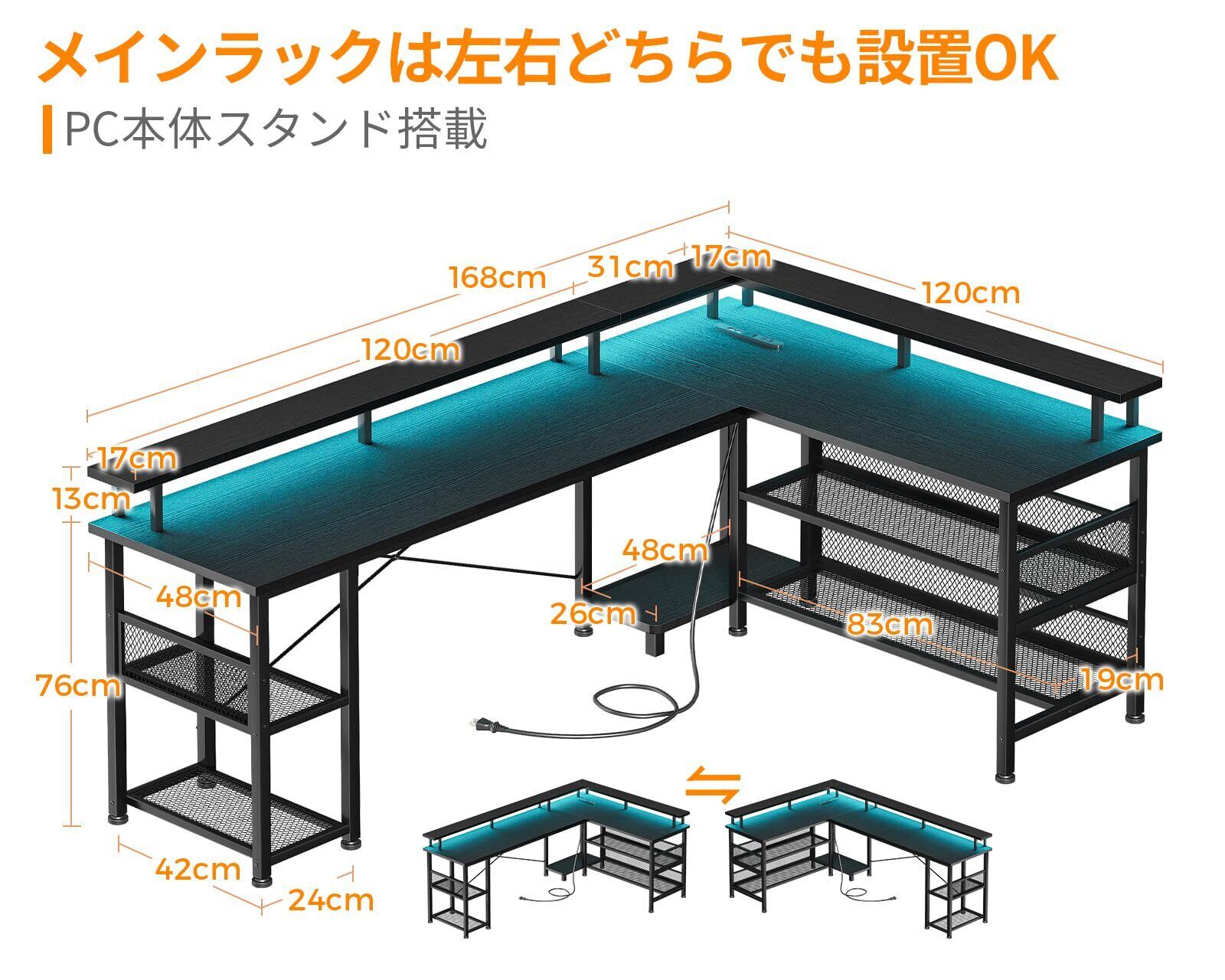 AODK ゲーミングデスク パソコンデスク コンセント付き l字デスク 机 pcデスク LEDライト付き 勉強机 棚付き オフィスデスク 幅168 ワークデスク 桌子 在宅勤務 事務机 組立簡単 ブラック
