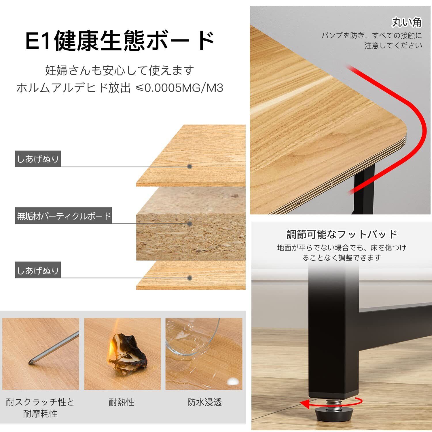 【固定・安定&傷防止・防湿】重量/安定性: 45kg.X字型の固定フレームと三角形の構造に太い炭素鋼パイプを組み合わせることで、机を強く、安定させ、耐摩耗性と耐食性を高めています。デスクトップは環境にやさしい無塗装板でできており、厚さ15mmの無塗装板は環境にやさしく、無臭で、高温耐性、耐傷性、防湿性に優れています。