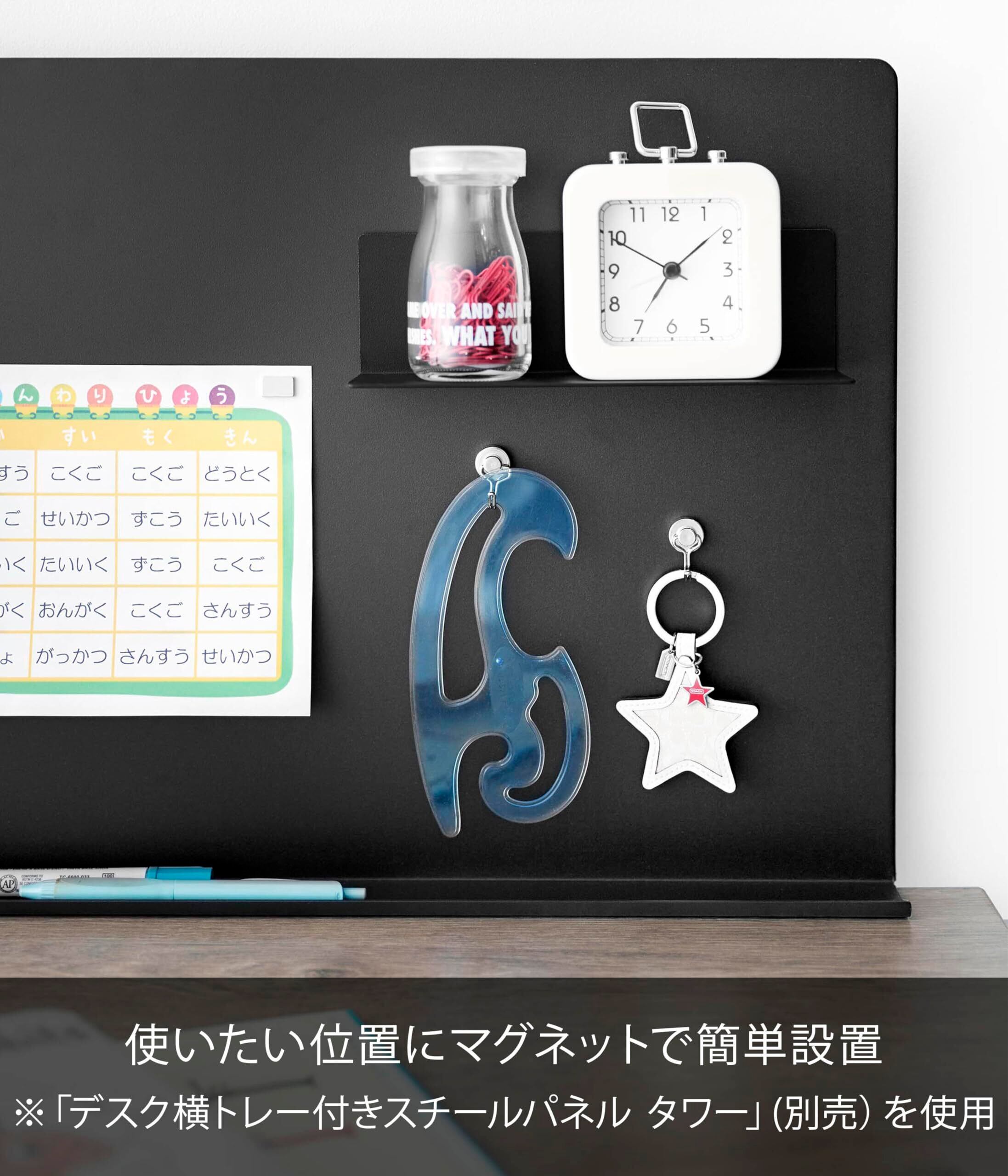 別売りのデスク横トレー付きスチールパネル タワー(品番10066/10067)やマグネットペンスタンド タワー スチールパネル対応(品番10096/10097)を一緒に使用すれば、デスク周りをスッキリ整理することができます。