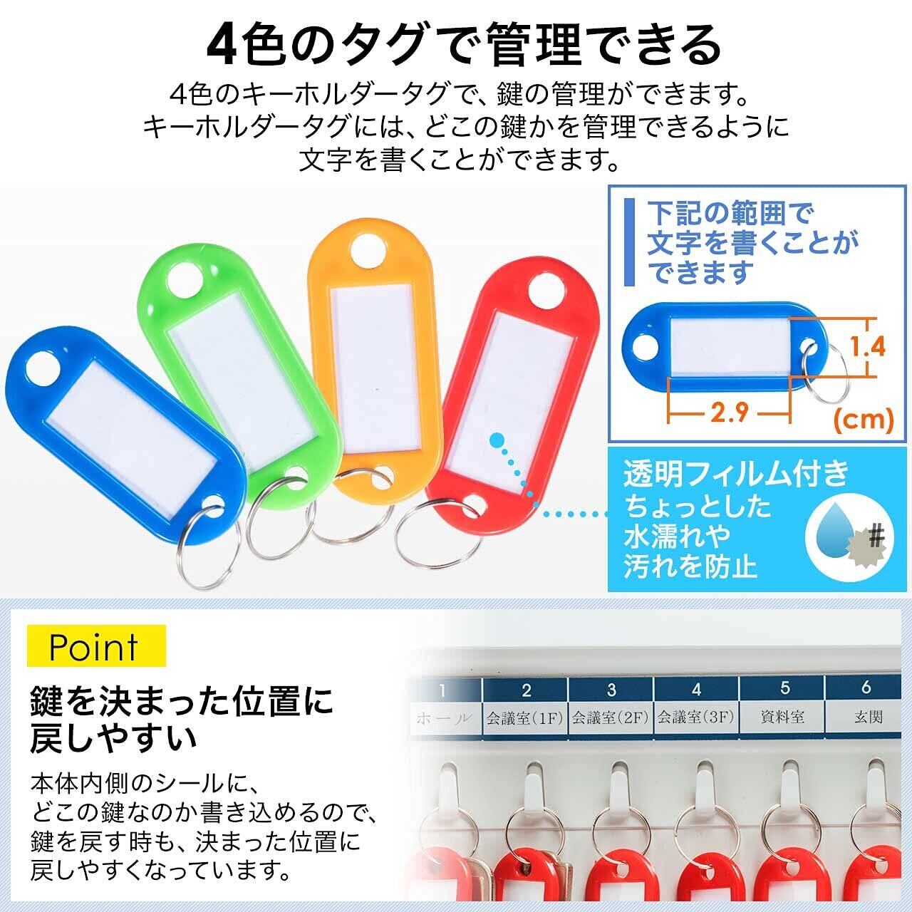 4色のキーホルダータグで鍵の管理が可能です。キーホルダータグは、W29×D14mmの範囲内で文字を書くことが可能です。