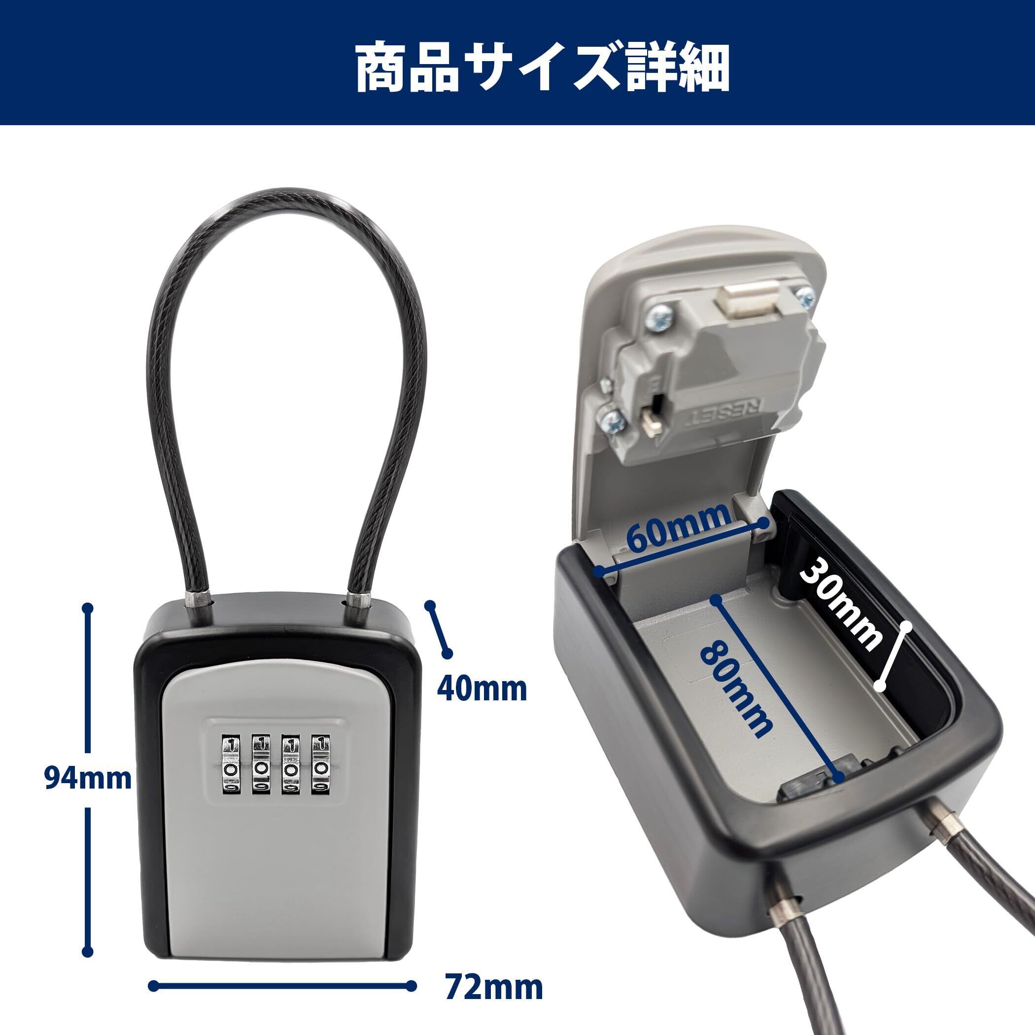 【サイズ】本体外寸:H94×W72×D40mm 本体内寸:H80×W60×D40mm (※ダイヤル裏は10mm厚まで) ワイヤー:全長260mm【重量】300g 【材質】ステンレス鋼 SUS420 【セット内容】本体1個 【使用用途】鍵や小物の保管、管理、受渡 【カラー】グレー×ブラック