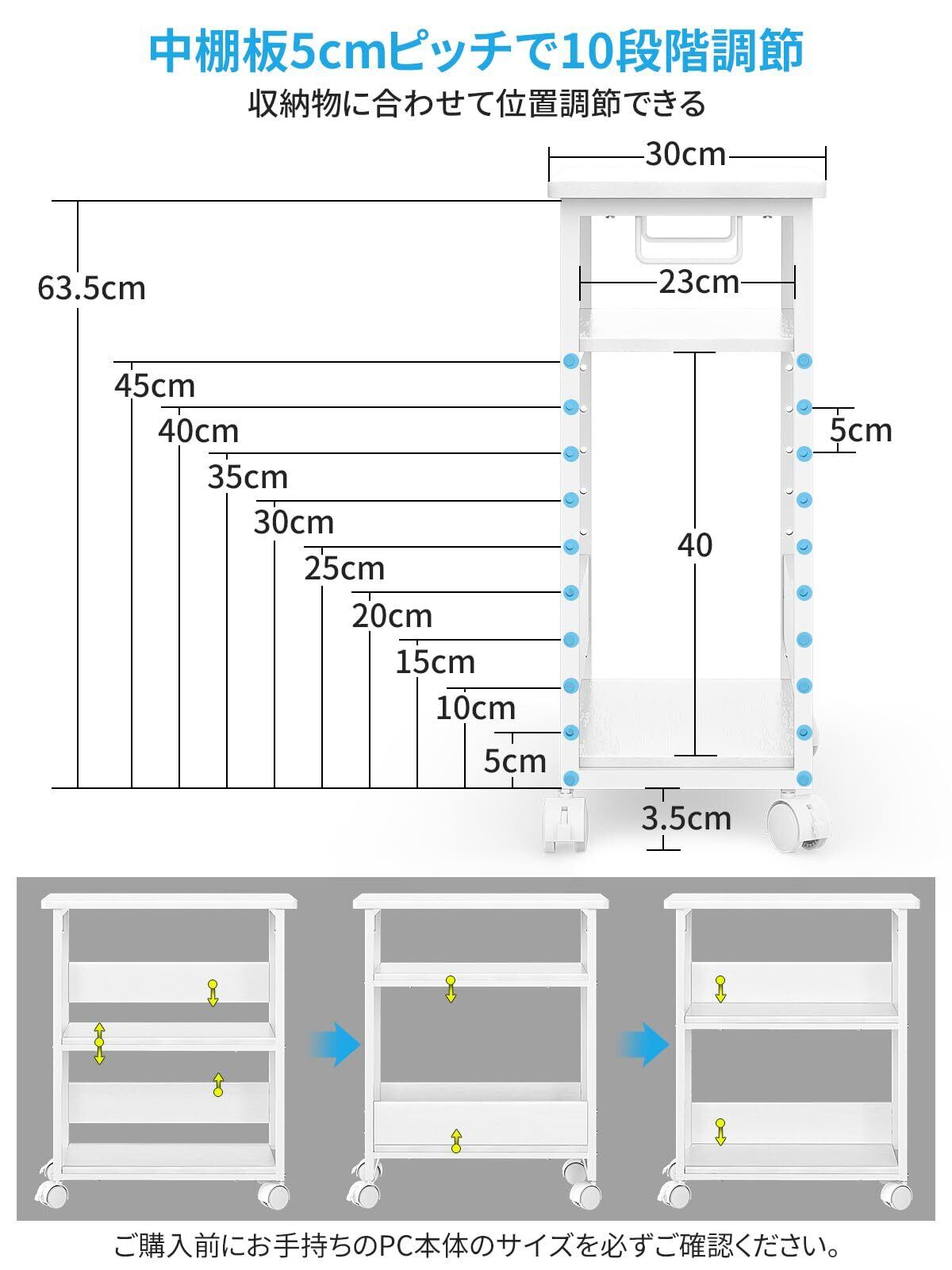 高さ調節に対応した可動棚付き:パソコンワゴンの中棚が可動で、用途に合わせて5cm間隔で9階段高さを調整可能です。収納物に合わせて高さ調節できるので、スッキリ収納することができます。収納空間を絶対無駄に使うわけはないです。