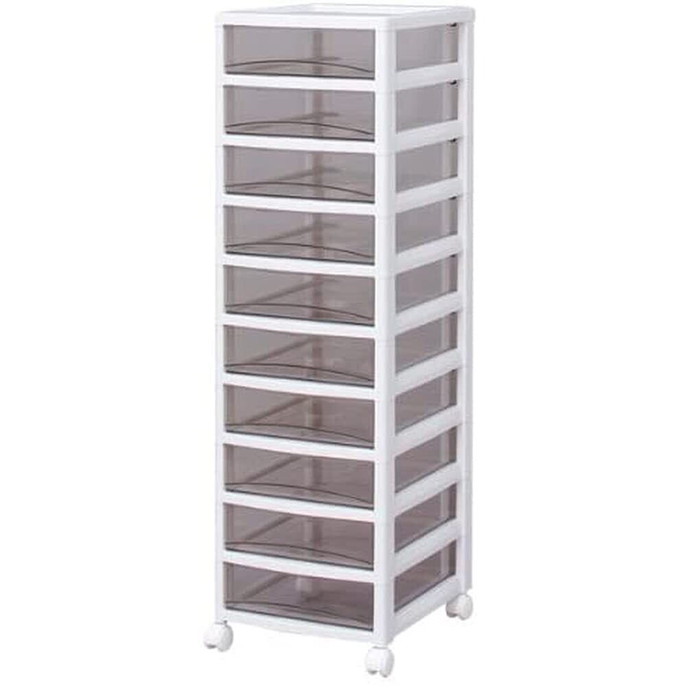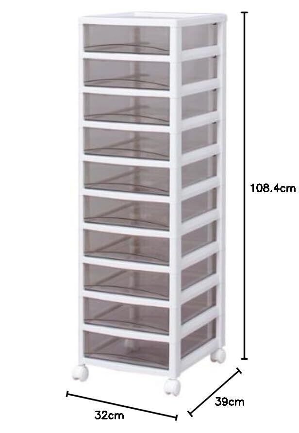 ●引き出しの材質にスチロールを採用しているため透明度が高く、中身が確認しやすいクリアタイプのチェストです。●引き出しは飛び出しにくい、簡易ロック構造です。●移動に便利なキャスター付です