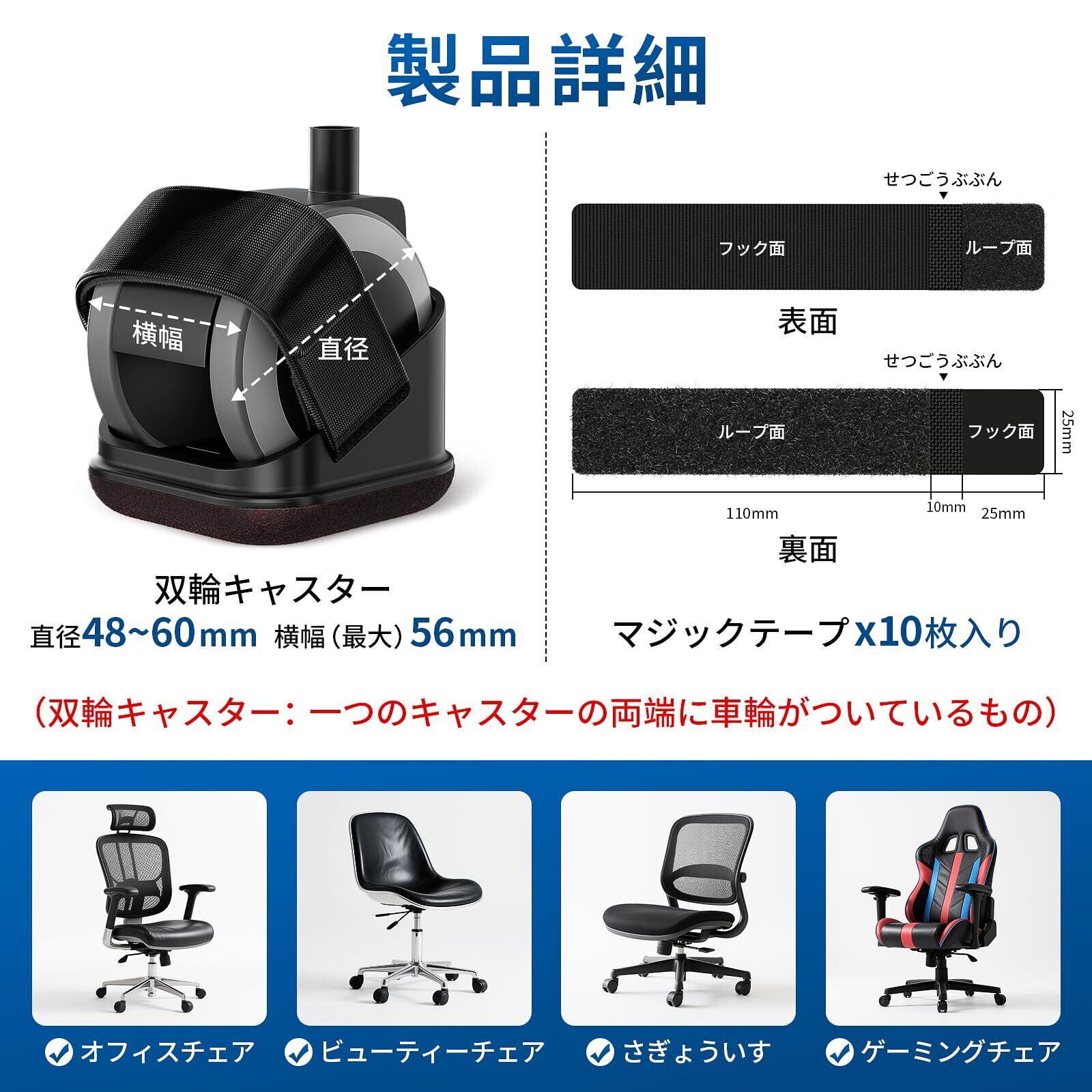 【取り付け・汎用性抜群】面倒な工具は不要!マジックテープを製品に結び、キャスターに取り付ければ完了です。デン、リビング、オフィスなど、さまざまな二輪キャスターや床におすすめです