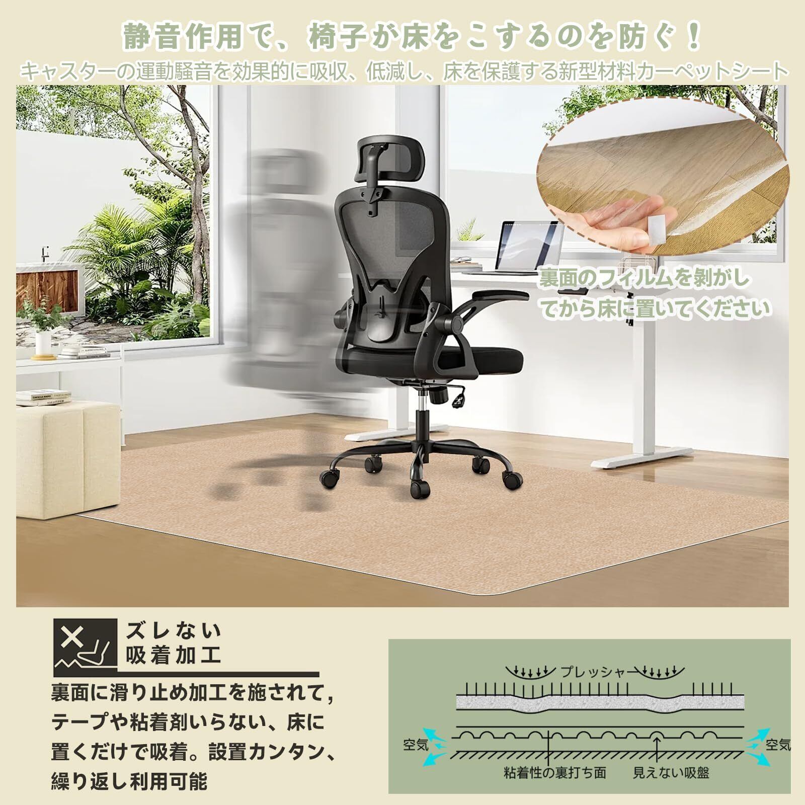 ✨適度な厚みを持ち、チェアが滑らず安定した座り心地を実現します。滑り止め加工により、椅子の動きもスムーズになり、作業に集中しやすくなります。