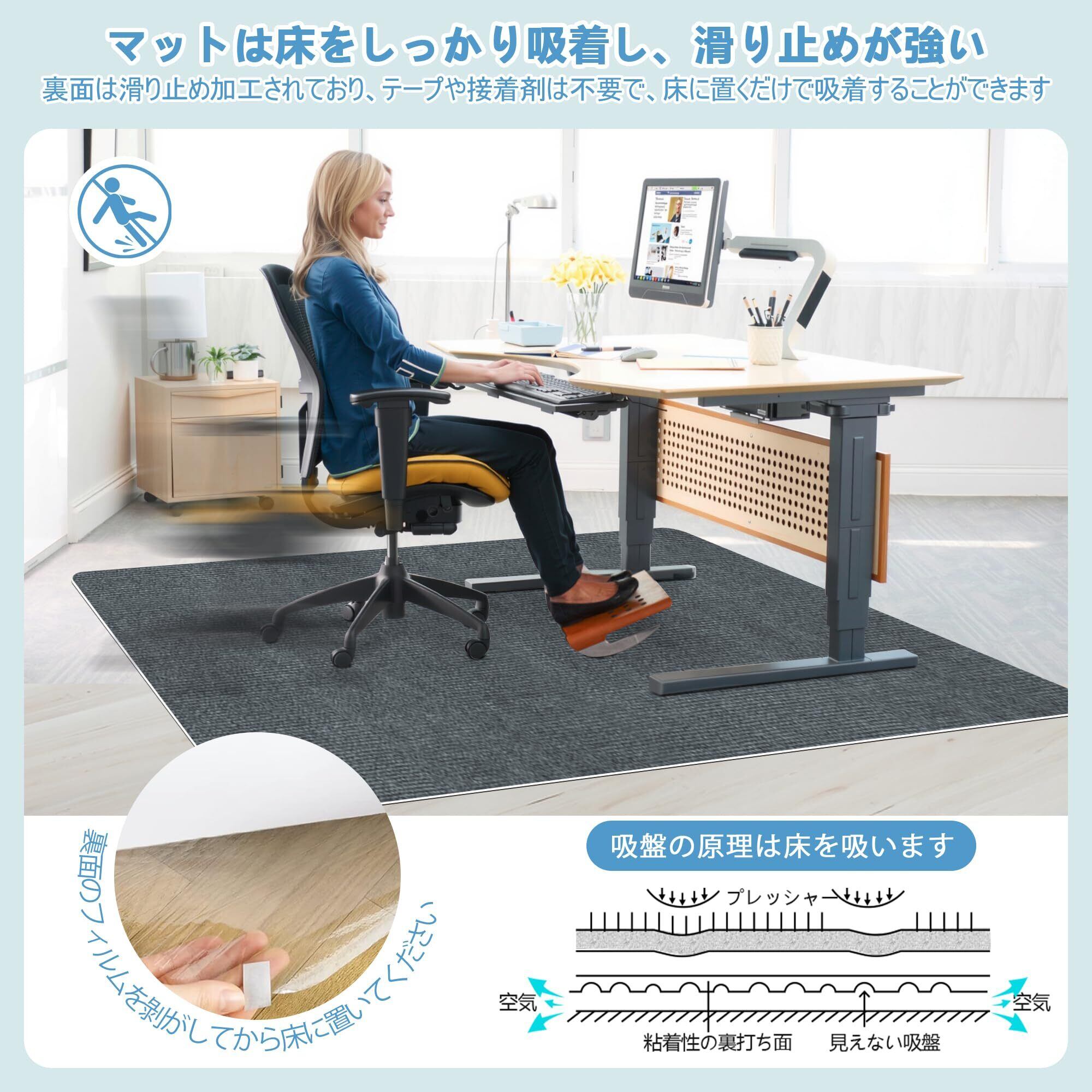 【強くグリップして手入れしやすい】フロアマットの底部には吸着構造設計が採用されており、地面との摩擦力を効果的に増加させ、フロアマットは滑りにくい。子供が学習机で宿題をしても、大人が食卓の前で食事をしても、ペットが家で勝手に走り回っても、安定した支えを提供し、滑りを減らすことを予防することができます。洗浄後は必ず徹底的に乾かし、湿った環境によるマットの損傷を避ける。