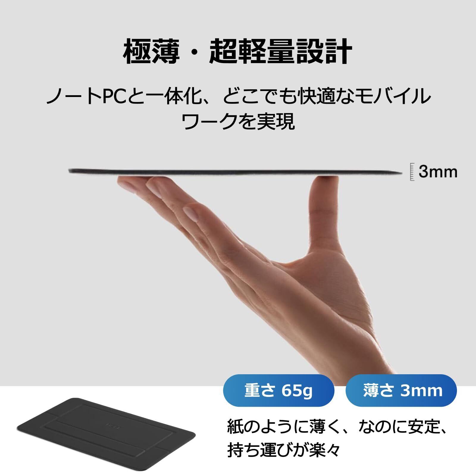 【製品詳細· 安定性抜群】サイズは約224*135、厚さ2.5mm、わずか65gと超コンパクトで、付けていることを忘れる軽さなのに耐荷重5kg以上!強度と安定性を兼ね備えているため、お使いのノートPCをしっかり支えます。