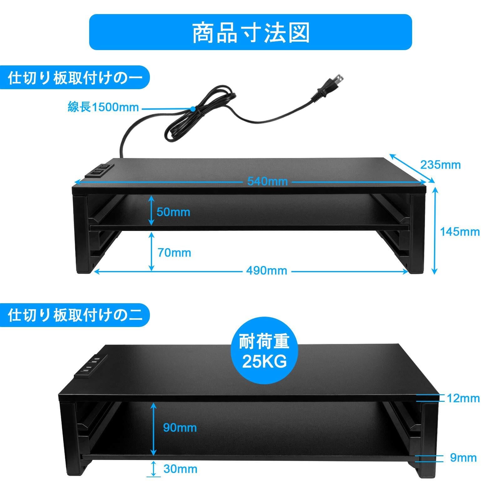 Point 1:モニター台はABS/合成繊維板で作られます。この素材はコストパフォーマンスが優れて、環境にやさしいです。耐荷重は25kgです。サイズ:54x23.5x14.5cm、天板の厚さは12mmです。