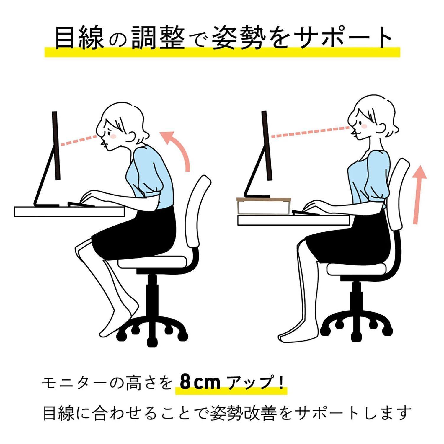 ✨高さ8cmのスタンドは、目線を上げて作業することを可能にします。これにより、首や背中への負担を軽減し、快適な姿勢をサポートします。長時間の作業でも疲れにくく、健康を意識したデザインです。