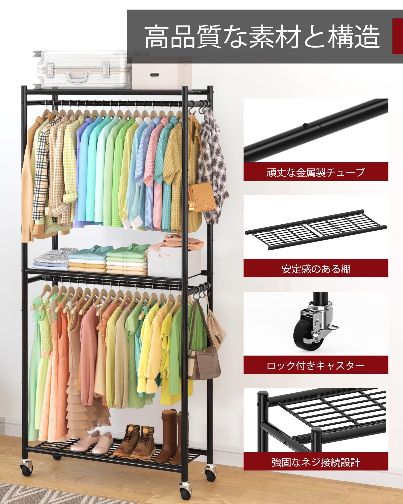 ✨このラックは2段のハンガーパイプを備えており、一度に多くの衣類を収納可能です。ドレスやコート、ジャケットなど、さまざまなアイテムを一元管理できるので、毎日のコーディネートがスムーズになります。