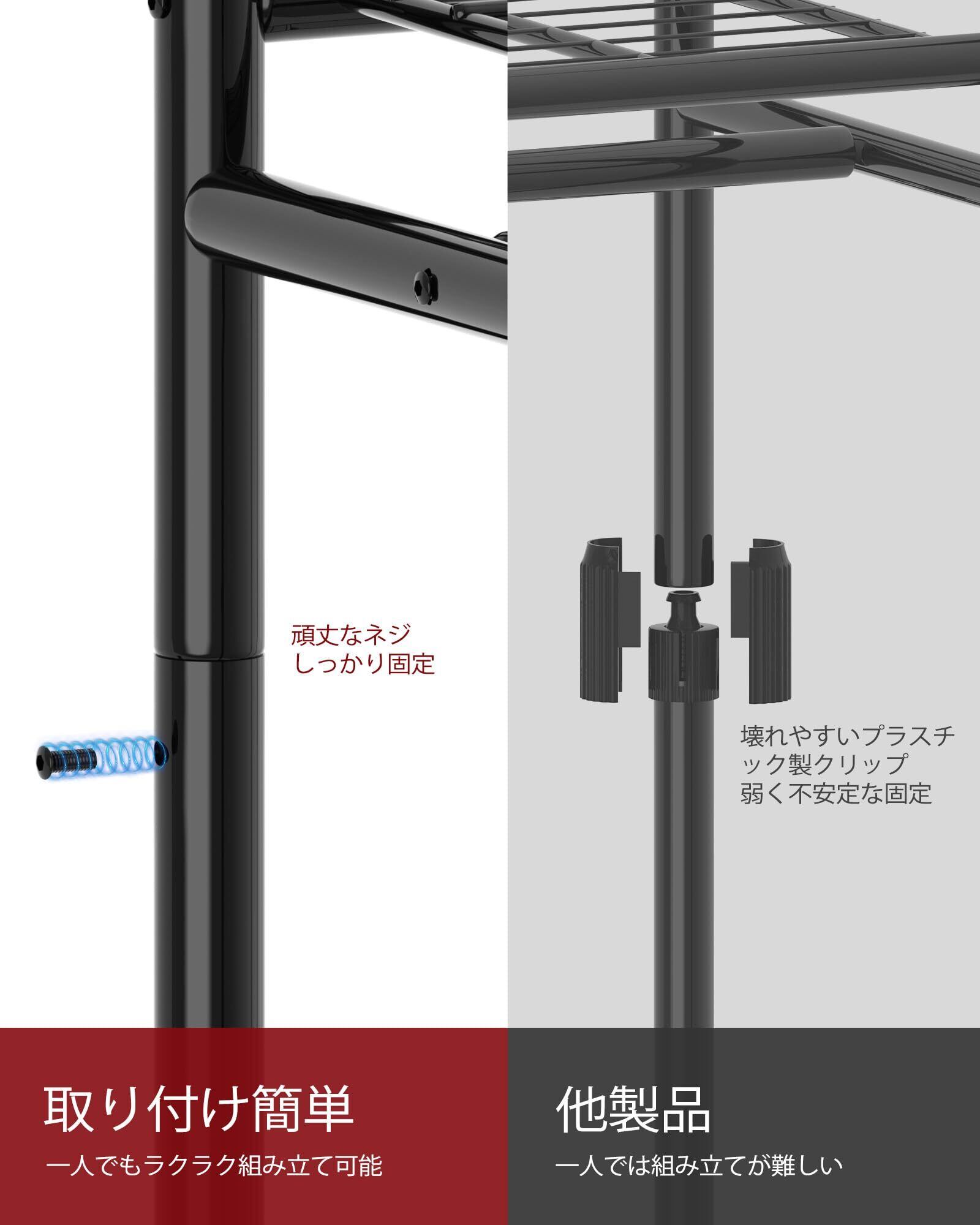 プレミアム構造:Sakugiメタルラックは、頑丈な金属管とメッシュ棚を採用した耐久性の高い構造で、優れた強度を備えています。このワードローブは安全なネジ接続により安定性が向上し、最大180kgまでしっかり支え、曲がることなく安定して使用できます。