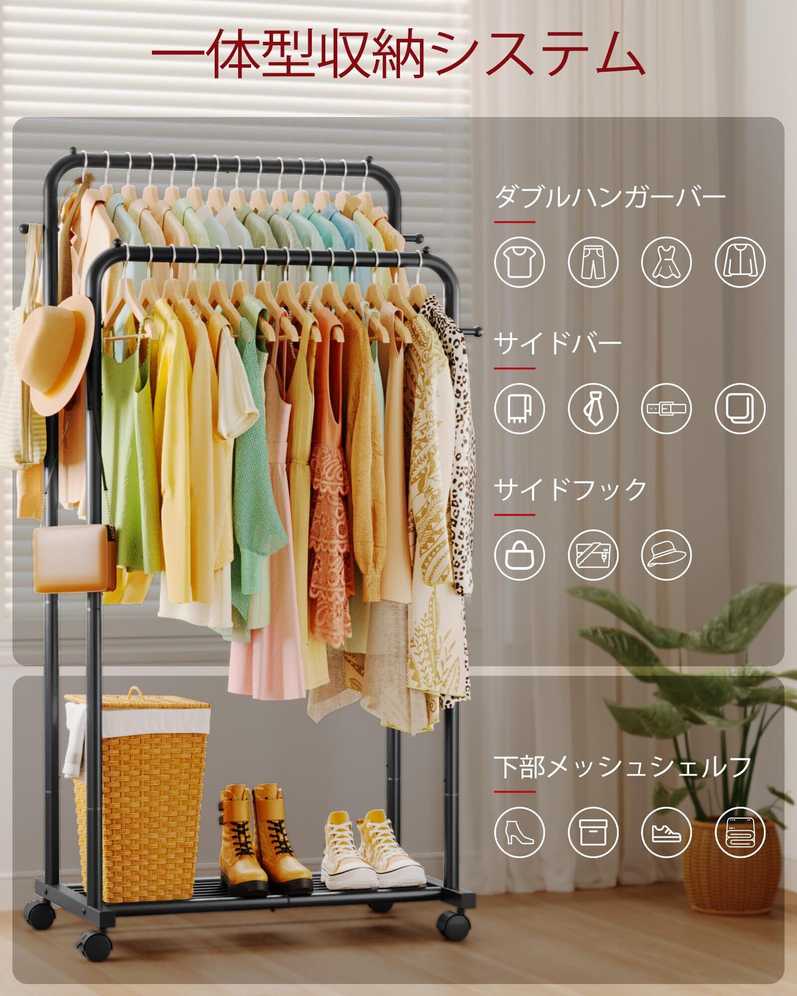 ✨ダブルロッド構造により、衣類をたっぷりと掛けることができ、上下に分けて収納することで、効率よく整理整頓が可能です。特に多くの服をお持ちの方に最適です!