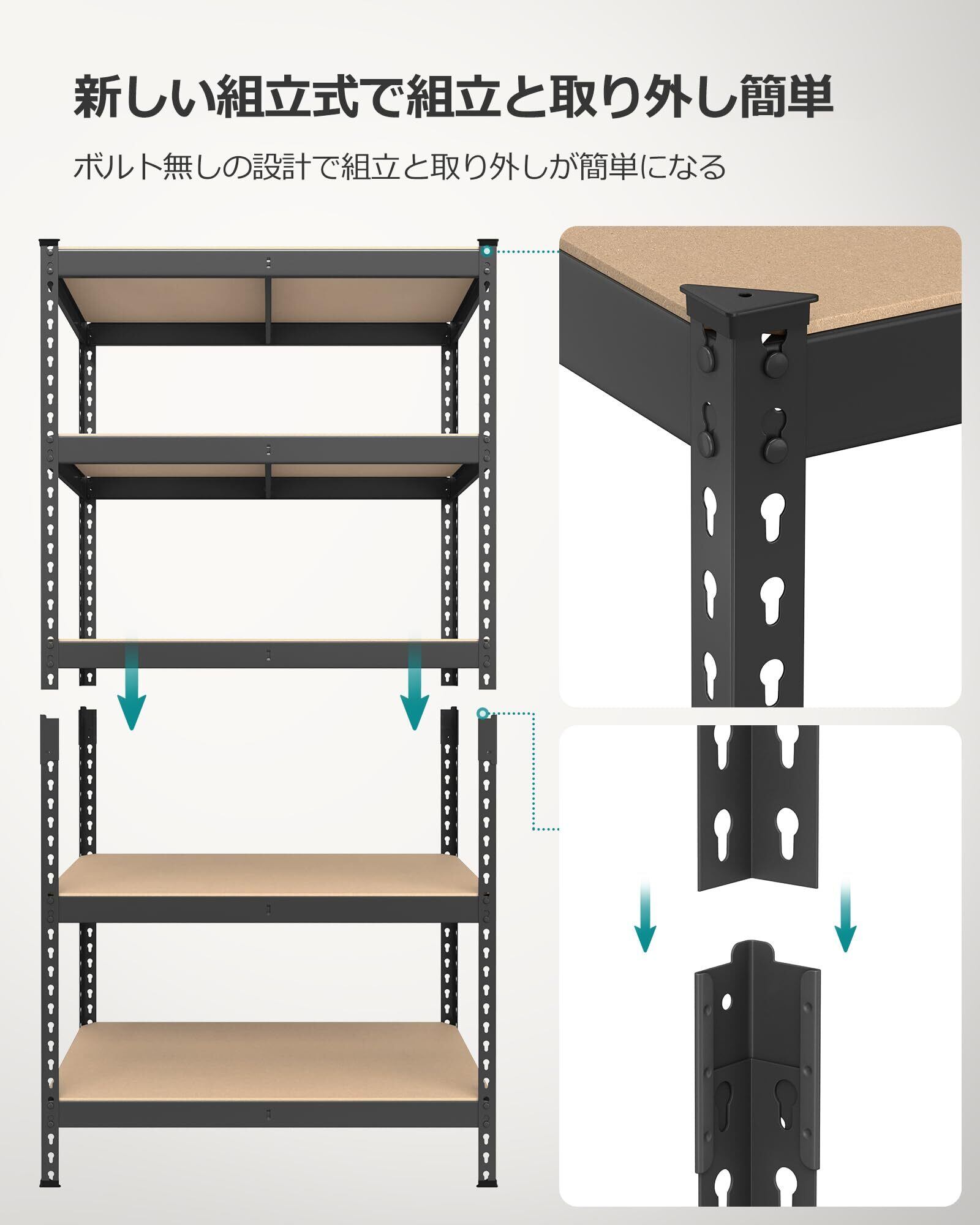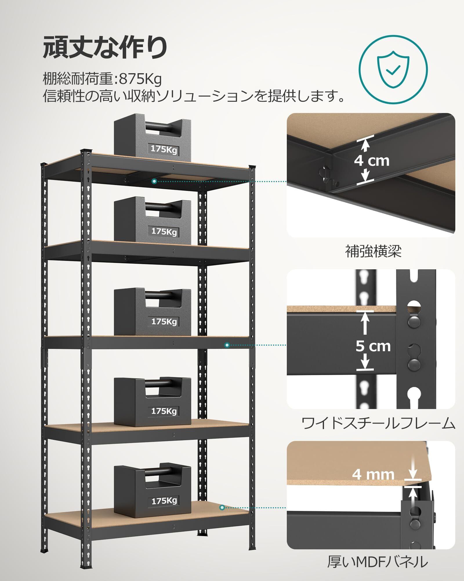 【抜群の耐久性と収納力】棚板1枚当たり約175kgの耐久性があり重い物を乗せても耐えられます。総耐荷重は875KGです。