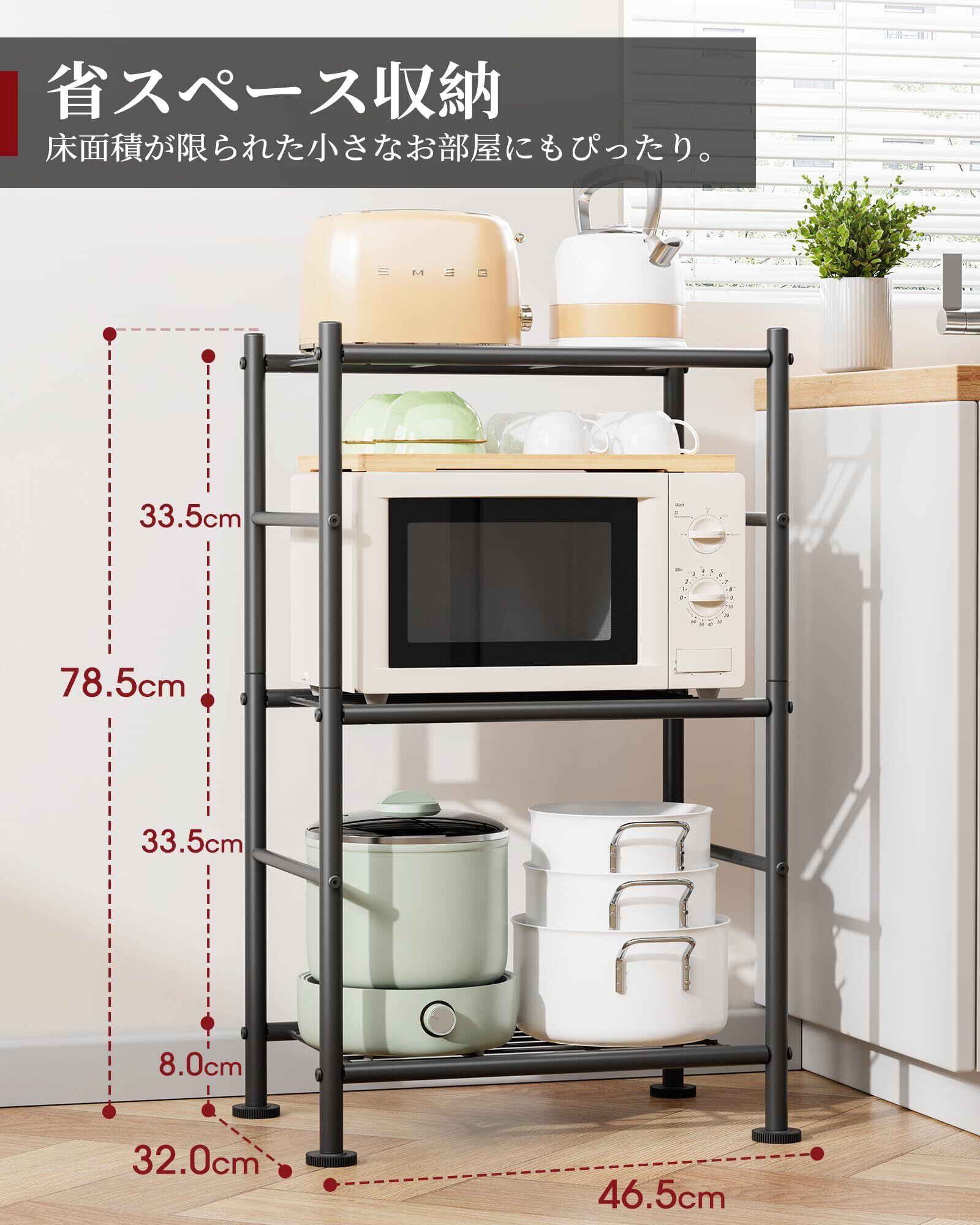 ✨長さ46.5cm、幅32cmのコンパクトなサイズでありながら、3層の棚を展開することで、限られたスペースを有効活用します。本や小物、キッチン用品など多様なアイテムをしっかりと収納できます。