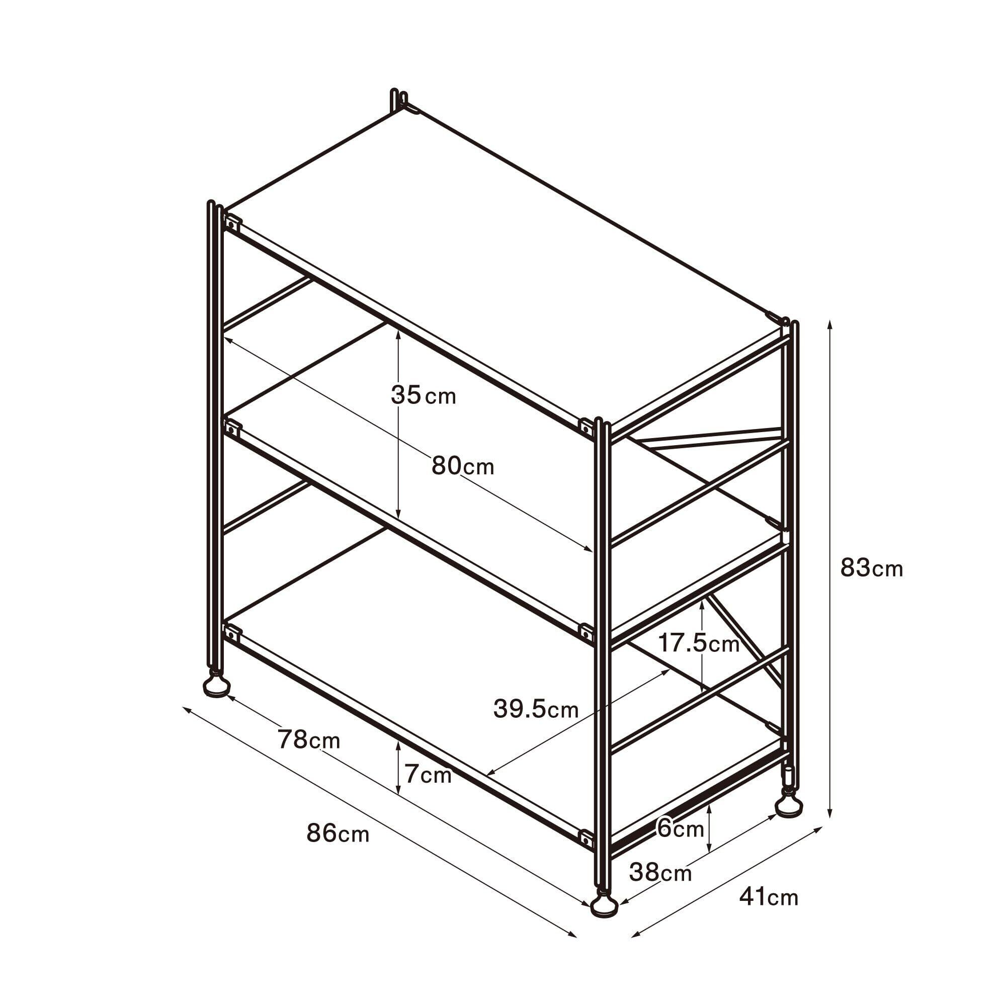 サイズ : 外寸 : 幅86×奥行41×高さ83cm・棚板取付時の有効内寸 : 幅80×奥行38cm・脚と脚の間の内寸 : 幅78×奥行38cm