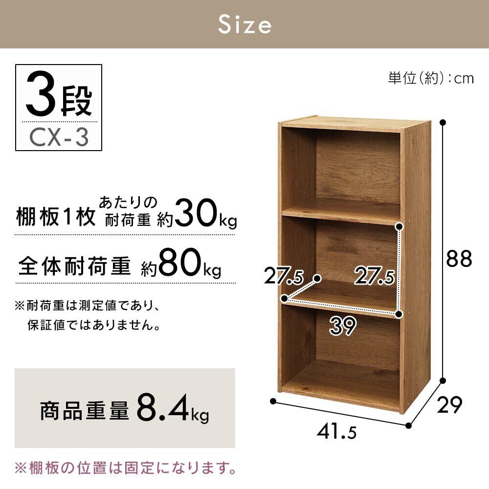 シンプルなデザインでどんなお部屋にもなじみやすく、使いやすさを追求した3段タイプのカラーボックスです。収納スペースとして本や小物、日用品などをすっきり整理できるため、リビングや子供部屋、オフィスなど幅広いシーンで活躍思案す。