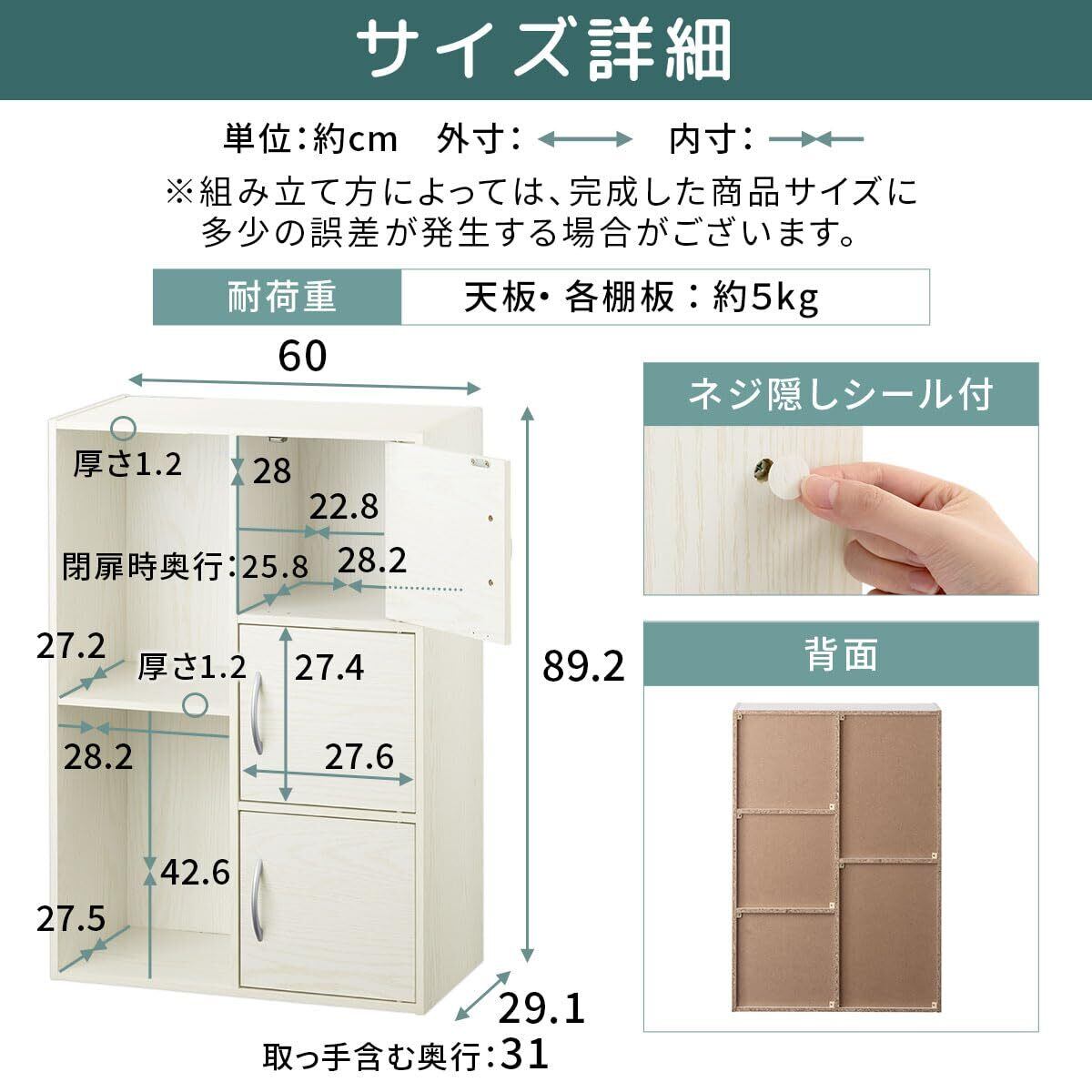 ✨設計にこだわり、各棚はしっかりとした構造で、安定した収納が実現されています。幅60cm、奥行29.1cm、高さ89.2cmのサイズながら、重たいアイテムもしっかり支えられますので、安心してご利用いただけます。