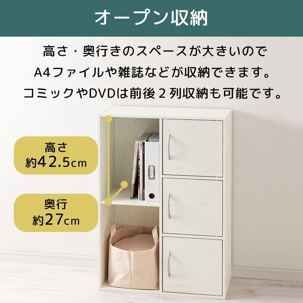 ✨扉付きの設計により、見せたくない物を隠しつつスッキリと収納できます。書籍や小物、日用品まで幅広く収納が可能で、必要なものをすぐに取り出せる便利さが素晴らしいポイントです。