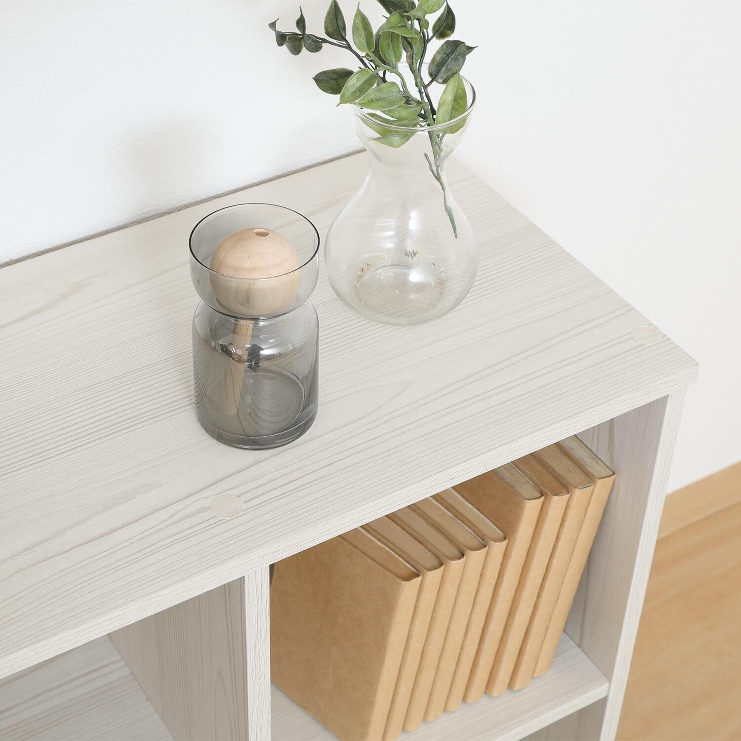 不二貿易のカラーボックスは、実用性とデザインを兼ね備えた優れた収納アイテムです。ホワイトウォッシュの穏やかなトーンが、さまざまなインテリアに調和し、空間に爽やかな印象をもたらします。