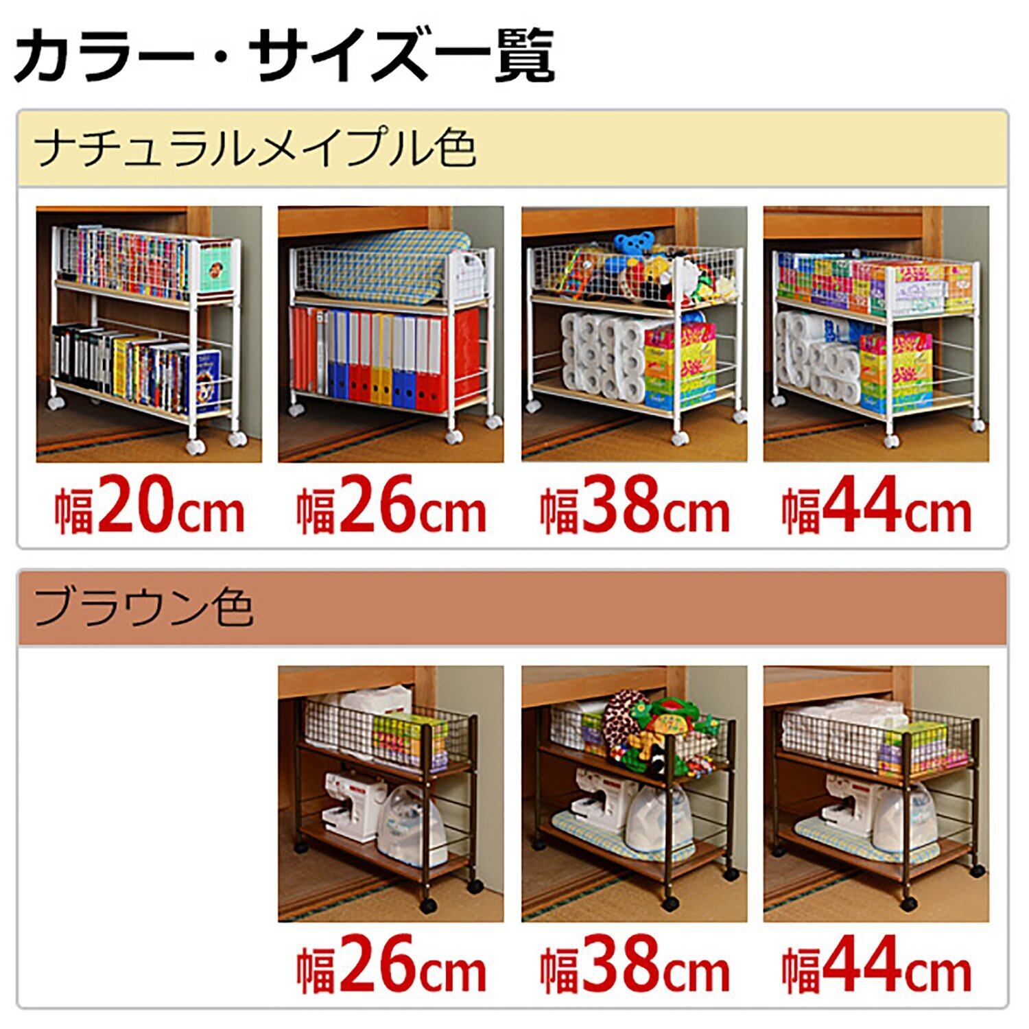 ●押入れ下段に最適なサイズ(高さ65cm)●キャスター付なので押入れから出入れが楽々●上段はビデオやコミック収納に最適サイズ●下段にはティッシュの買置き等に便利●落下防止と取出しに便利な可動ネット●キャスター4個(うちストッパー付2個)●組立品(組立時間:約20-30分)