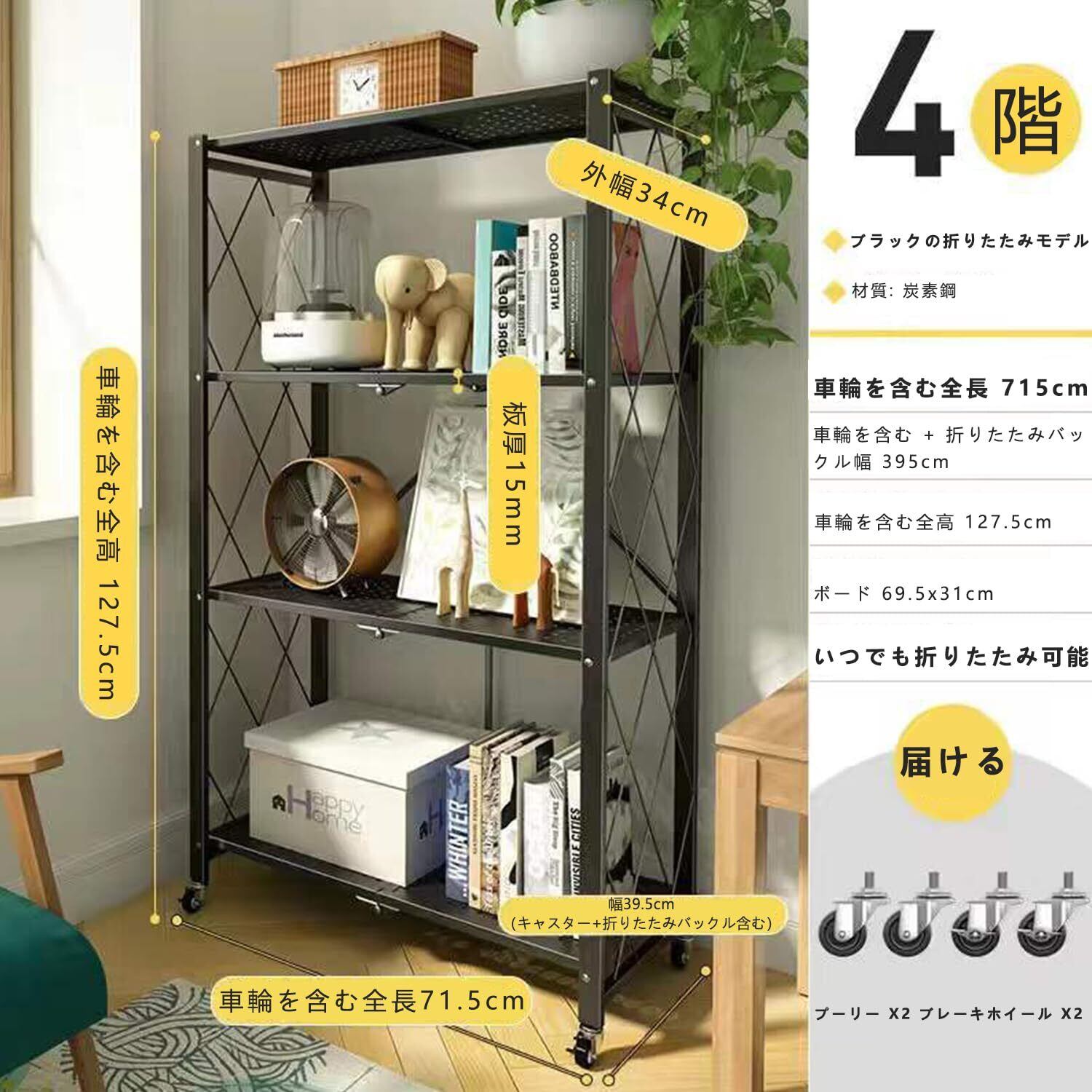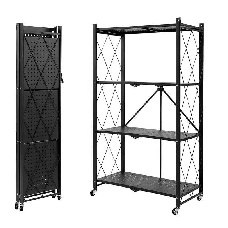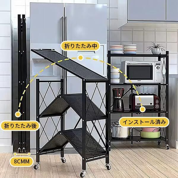 折り畳み メタルラック 折りたたみラック 4層 大容量 幅70CM 金属製の収納ラック 折り畳み棚 360°キャスター付きで移動可能 ック設置不要 家庭用収納ラック キッチン 寝室 応接間 書斎などに (ブラック, 四階)
