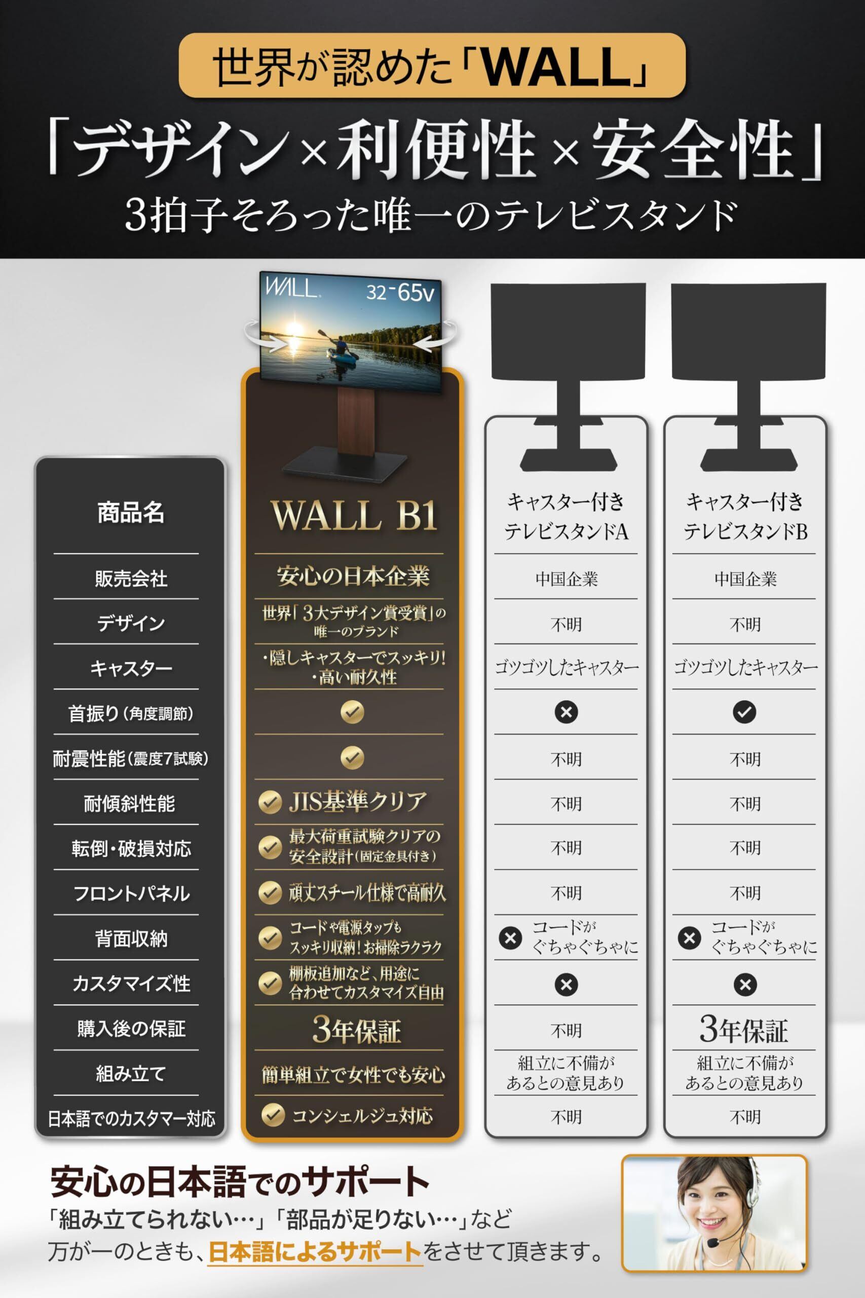 WALL B1テレビスタンドは、耐震性とデザイン性を兼ね備え、様々なライフスタイルに対応するアイテムです。快適なテレビ視聴を実現するための必須アイテムとなることでしょう。