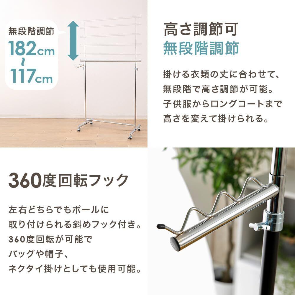 【高さ調節可能】高さは117cmから182cmまで無段階で調節可能。子供服からワンピースやロングコートまで、掛ける衣服に合わせて好みの高さに調節できる。