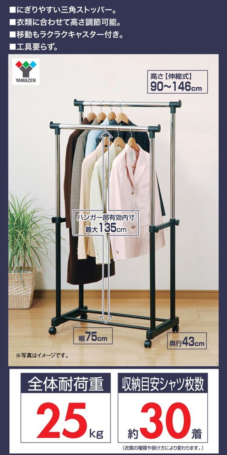 \【◆山善(YAMAZEN)】【ハンガーラック】【ダブル】【キャスター付き】【全体耐荷重25kg】【ブラックメタルハンガー】【幅75×奥行43×高さ90-146cm】【組立品】【ブラック】【BH-W】/機能性とスタイリッシュさを兼ね備えた収納 Solution が新登場です!