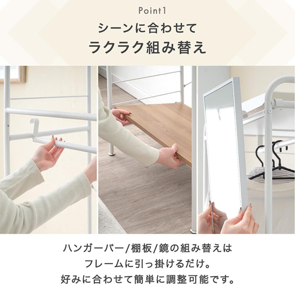 【スタッフのおすすめポイント】・シーンに合わせてラクラク組み替え・使い方広がる可動ハンガーバー・用途に合わせて調整できる可動棚・身だしなみチェック!鏡付き・置く場所に合わせて選べる2サイズ・シンプルかつ実用的なフレームデザイン・使い方に合わせて選べるキャスター/アジャスター脚