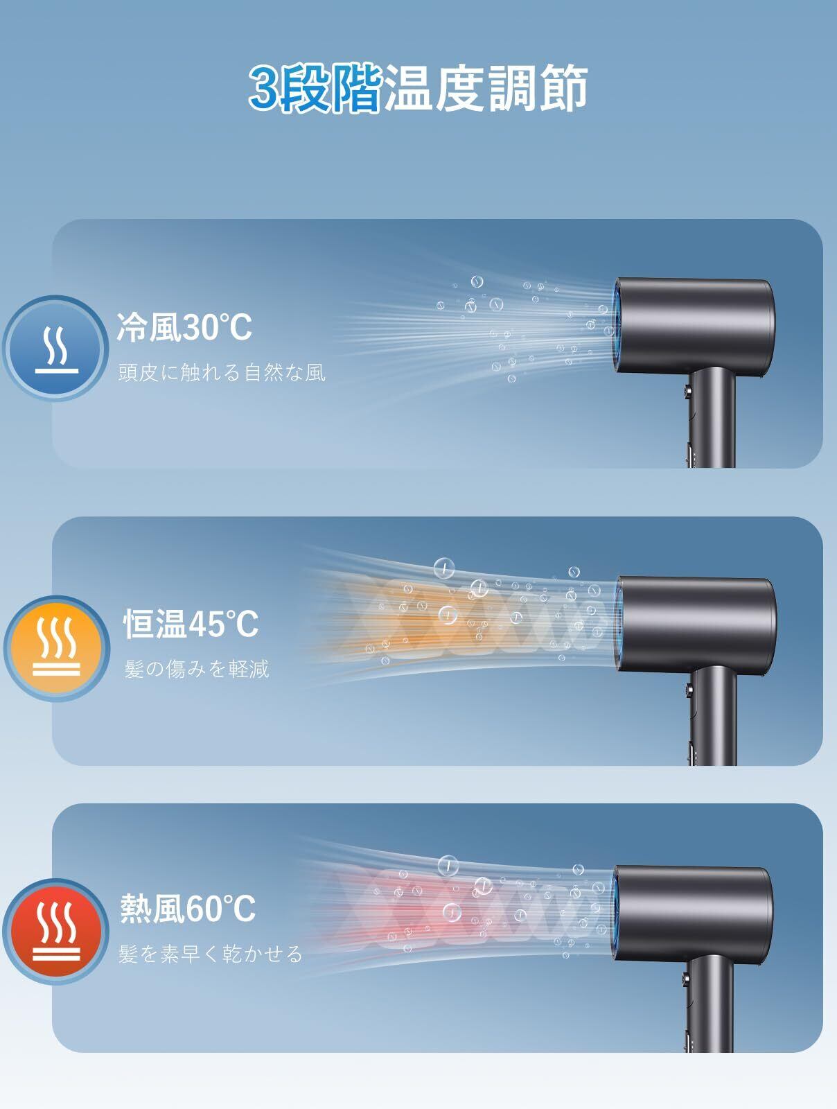 ✨冷風と熱風の切り替えが可能な3段階温度調節で、シーンに応じたスタイリングが思いのまま。髪への負担を軽減し、安心してご使用いただけます。
