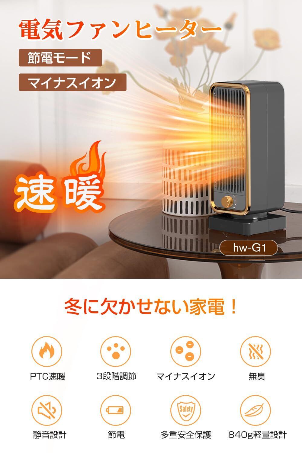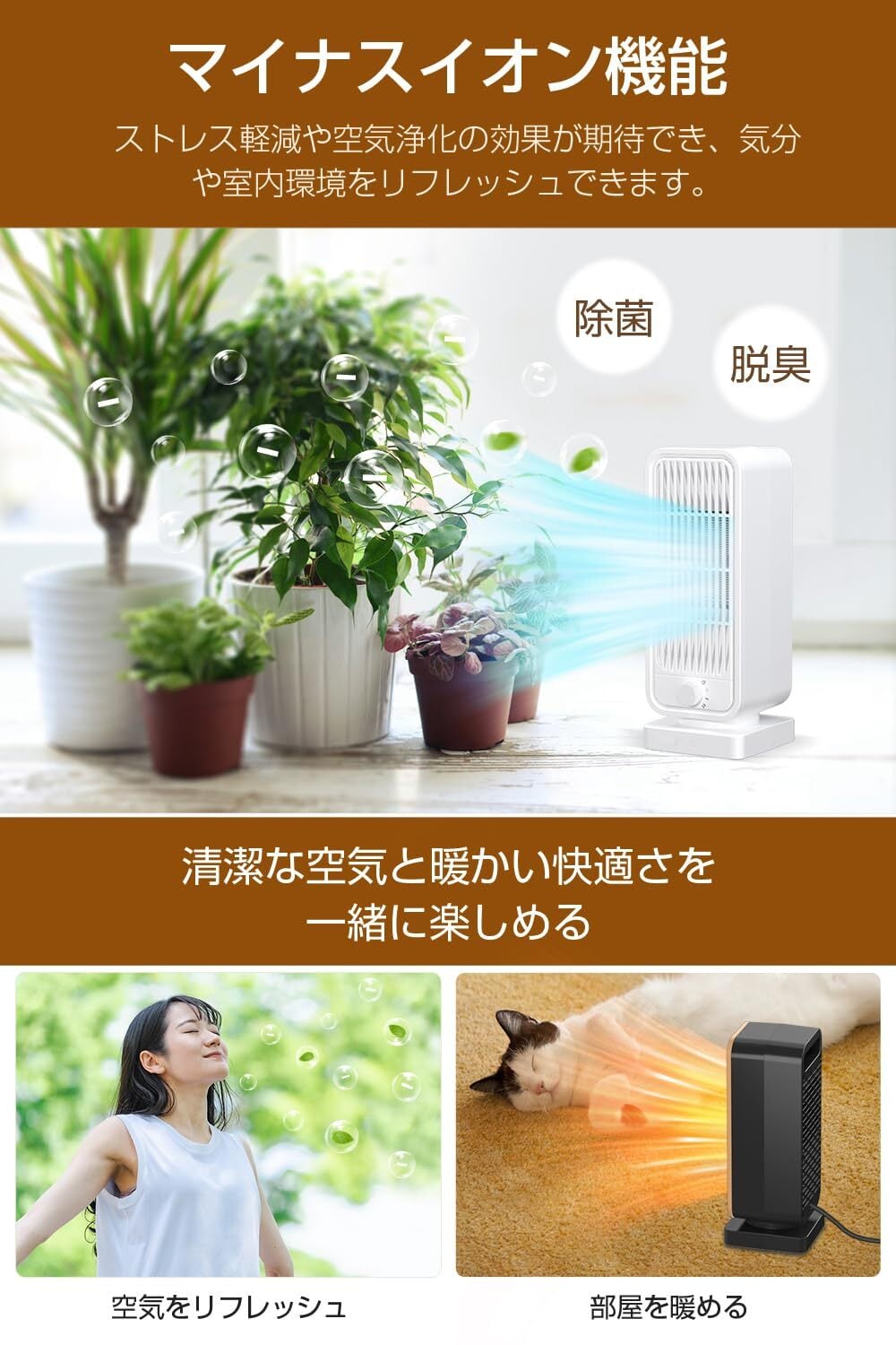 【速暖×大風量×マイナスイオン、高機能ヒーター登場】最大900WのハイパワーPTCセラミックヒーターを採用し、電熱転換率が高く、わずか2秒で温風を吹き出します。スイッチを入れた瞬間から暖かさが広がり、冬の朝や在宅ワーク時もすぐに快適な温もりを実感できます。大風量設計により、温風の到達距離は従来機種の約2倍になります。遠く離れた場所まで均一に暖め、寒さ知らずの空間を作ります。燃料を使用しない電気加熱方式のため、換気や補給の手間がなく、嫌なニオイも発生しません。さらにマイナスイオン機能を搭載し、空気中のホコリや花粉、カビなどを吸着して除去します。清浄な空気に包まれながら、ストレス軽減やリフレッシュ効果も期待でき、まるで森の中にいるような心地よい暖かさをお届けします。