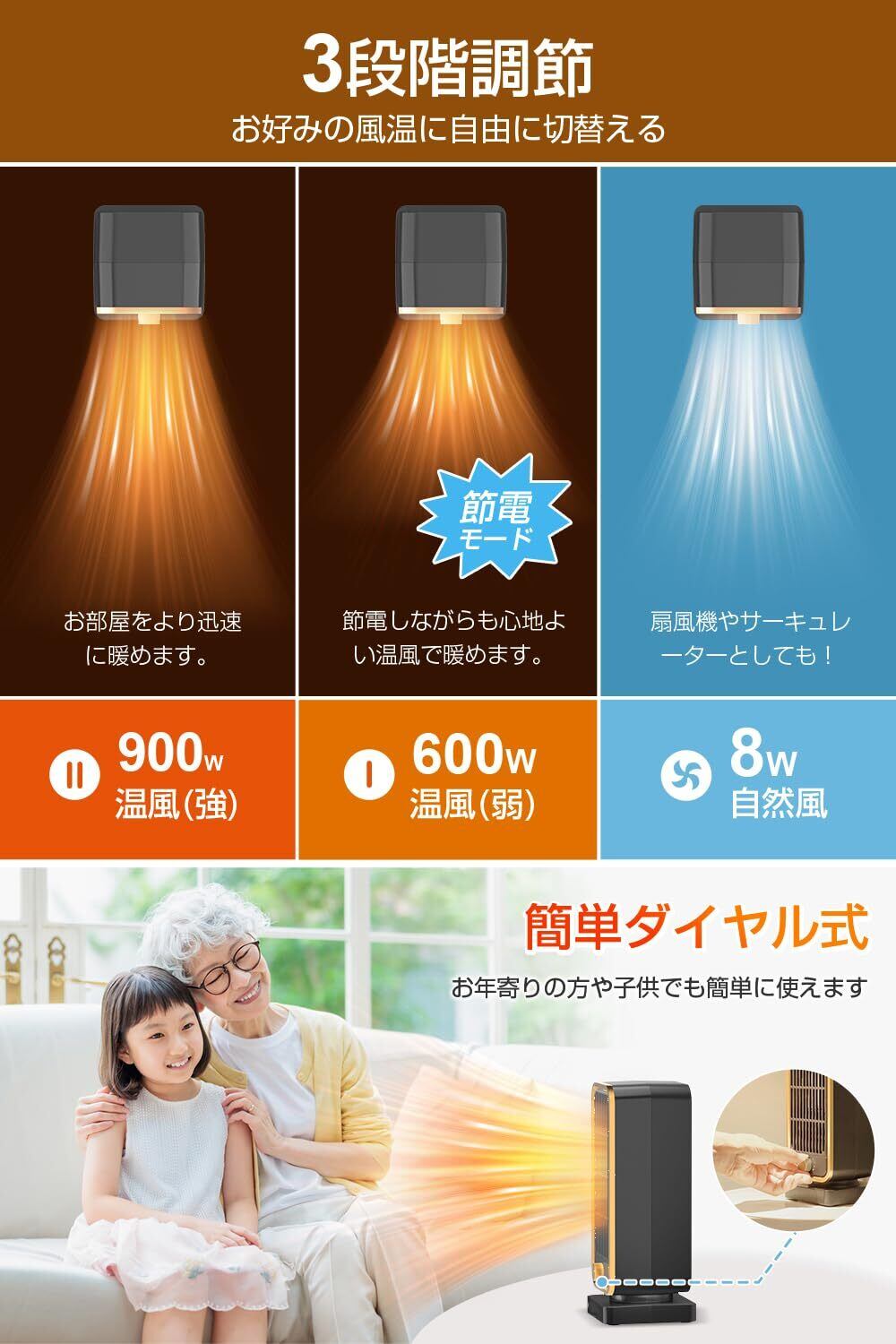 ✨【瞬時に暖かさを実感】このセラミックヒーターは、2秒速暖機能を搭載しており、寒い冬でもすぐに快適な温度に。900Wの高出力で、お部屋全体をしっかりと温めます。