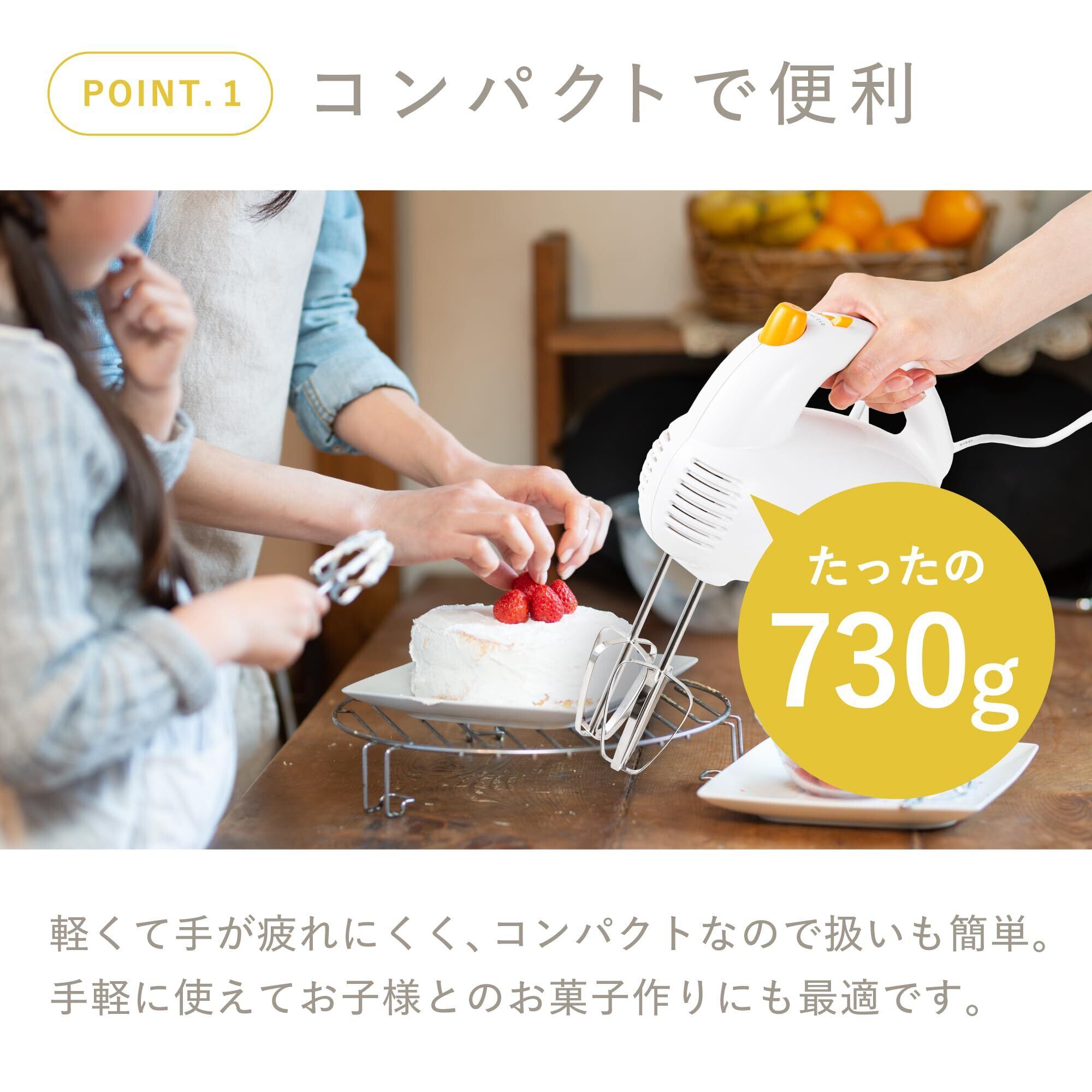 ✨強力なモーターを搭載しており、クリーミーな泡立てが可能。生クリームや卵白もあっという間に立てられるので、デザート作りやお菓子作りに大活躍します。手動よりも格段に早く、コツいらず!