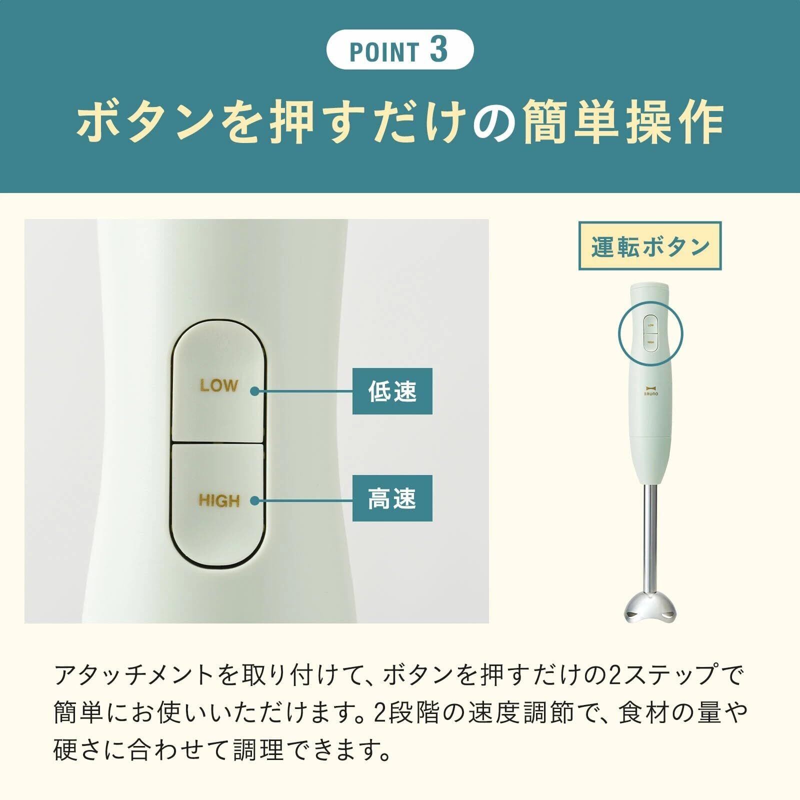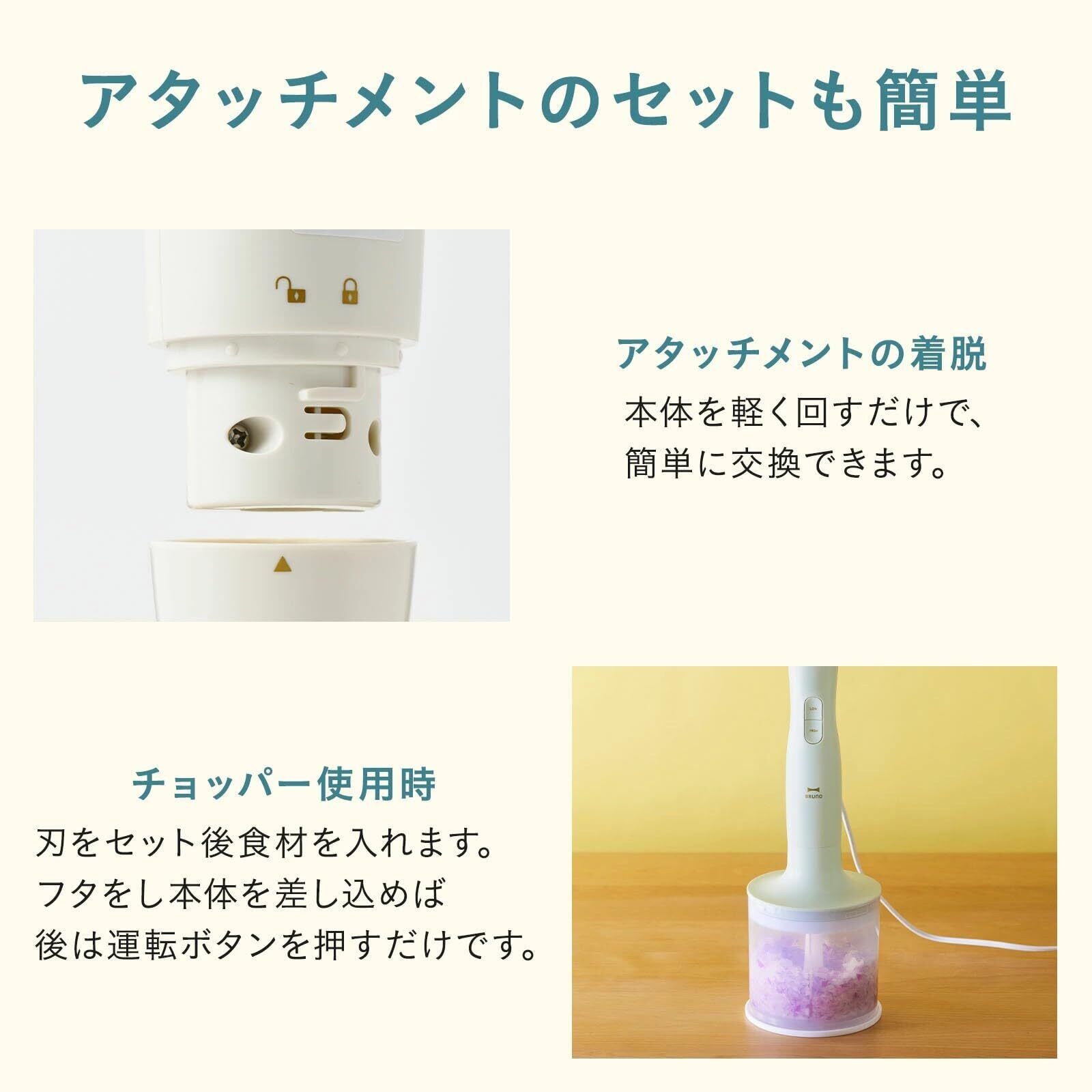 ブレンダー(つぶす・混ぜる)、チョッパー(刻む・砕く)、ホイッパー(泡立てる)、2段階速度調節