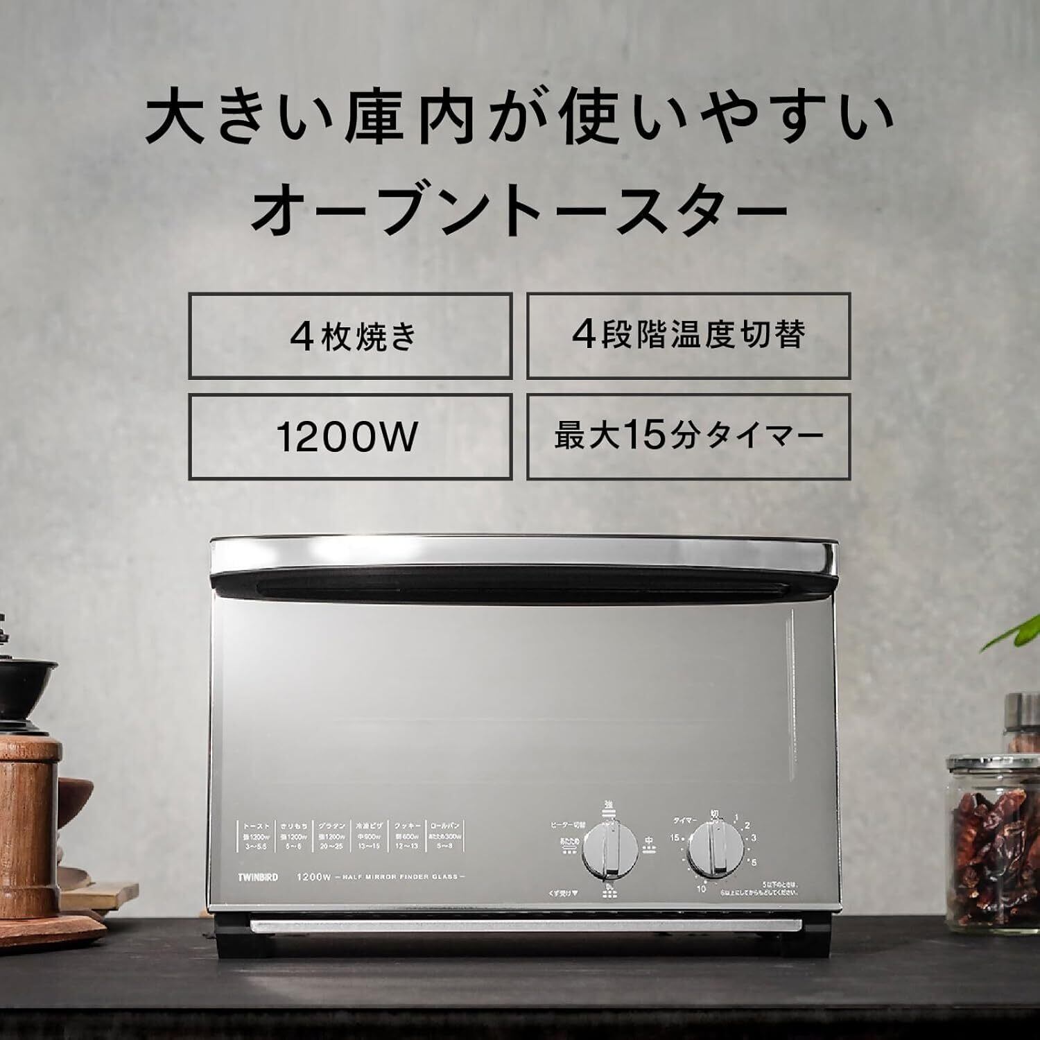 TWINBIRD(ツインバード) トースター オーブントースター 4枚焼き ピザ丸々入る広さ 1200W 15分タイマー 出力切替4段階 ミラーガラス 掃除しやすい スタイリッシュ ブラック TS-D047B